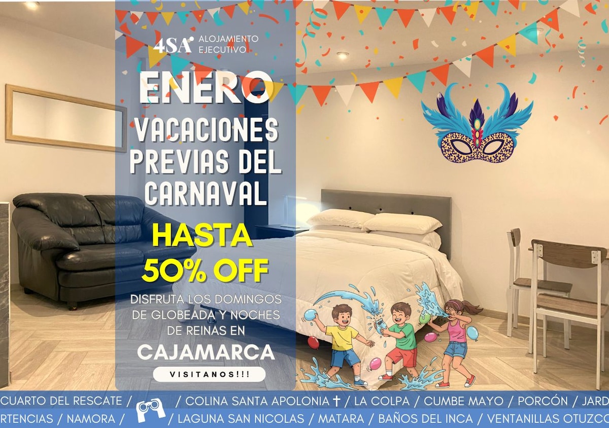 El departamento es exclusivo para ti Tienes de todo a un paso, a 5 minutos del complejo turístico Baños del Inca, la plaza de baños, supermercado Castope y el mercado. Tenemos un internet POTENTE, Ideal para Home-OFFICE, espacios pensados que puedas trabajar cómodamente. a unas cuantas cuadras tienes bodegas, restaurantes, cafeterías y pastelerías.
