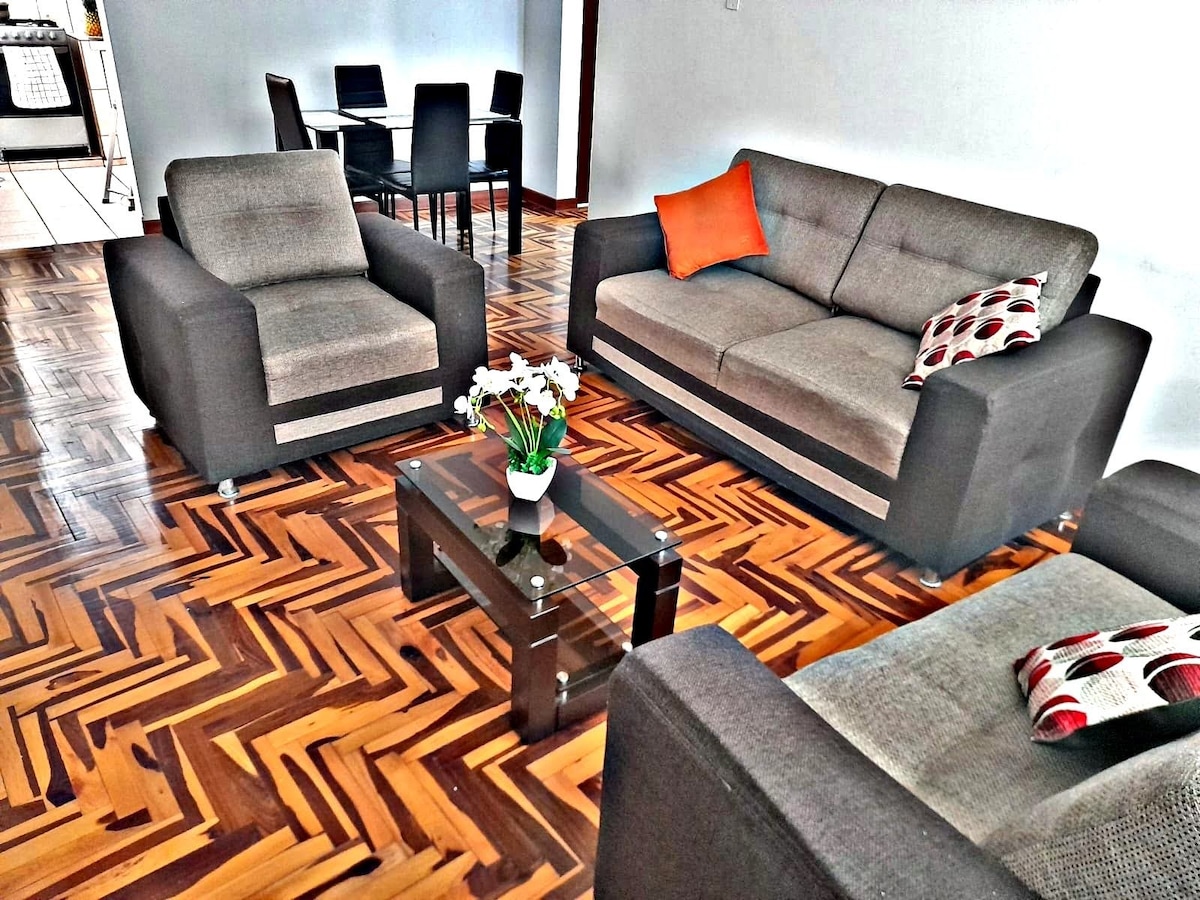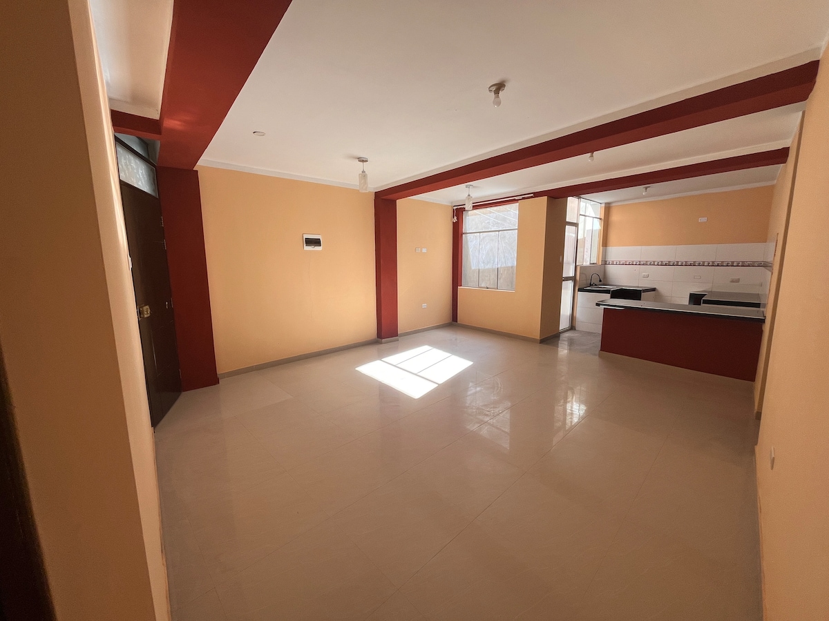 El departamento esta en una zona residencial segura y a minutos del centro. Minimarket con agente BCP en 1er piso. El depa cuenta de 2 amplias habitaciones, la habitación principal tiene una cama King de 2x2, la segunda tiene una cama matrimonial, tiene 2 balcones con vista a la calle, 1 baño con agua caliente en la ducha, SmarTV de 50" con Netflix. Cocina bien equipada. Reclama tu cortesía si reservas más de 1 semanas.