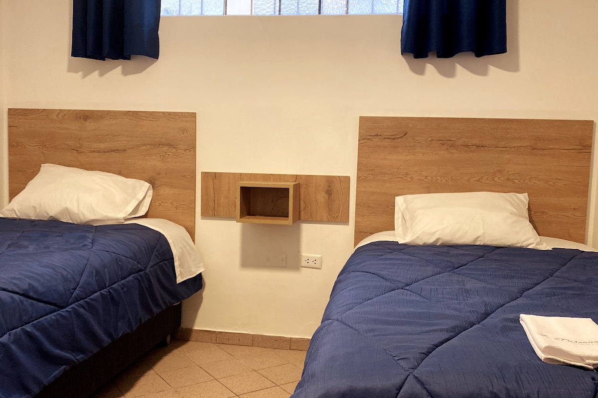 Habitación doble, cuenta con 2 camas de 1.5 plazas. Habitación con baño propio, agua caliente, TV de 24", cable TV, se ubica en el piso 3 del edificio, sin vista a exteriores. Puede alojar de 1 a 2 personas. Niños mayores a 2 años pagan como un adunto.