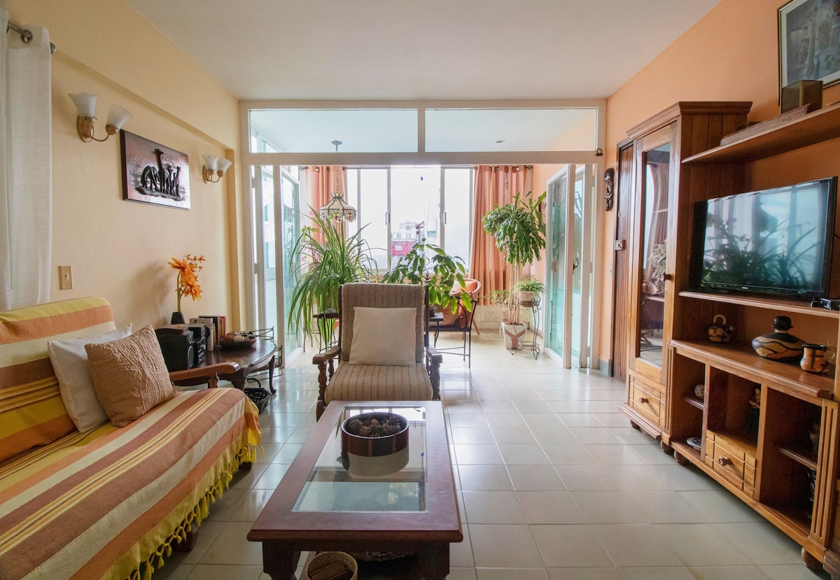 Peaceful 2-bedroom, 2-bath, 100 m² penthouse in Miramar, 20 minutes from the city centre. - Free WIFI - Solar-Battery Power Backup System ensures you'll never lose electricity during power outages. - Recently remodelled, equipped kitchen and city-view balcony. - The apartment is on the 3rd floor (last) of a family building. - The building doesn't have an elevator, but there are only 54 steps up to the apt. Ask anything— we reply within the hour. Reserve your Havana stay now!