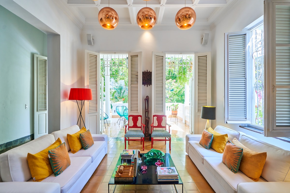 Luxurious and comfortable colonial house from 1919, meticulously well maintained, located in the city center, 6 minutes walk from the Havana seafront and all the most emblematic hotels. Residential area close to everything, very peaceful, you can hear the sound of birds contrasting with large groves. Large outdoor terraces, personalized attention that guarantees exquisite cleanliness, seal of excellence of our space. Maximum capacity of 24 guests, free wifi.