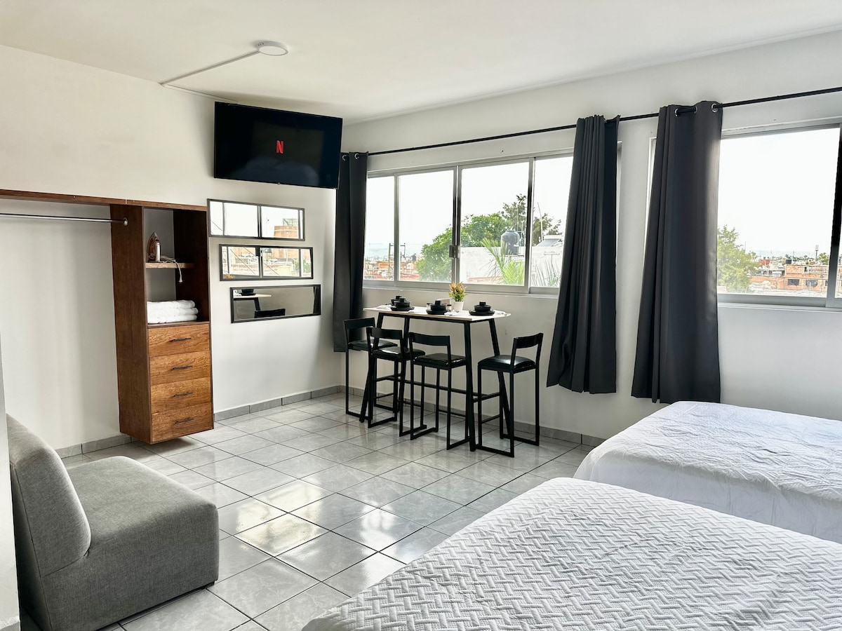 Loft independiente y acogedor, excelente ubicación. Cama King, TV cable y estufa de inducción magnética . A unas cuadras del estadio Victoria y Deportivo IV Centenario. Cerca del complejo ferrocarrilero donde se ubican el Museo de Arte Contemporáneo, Hospital Hidalgo, oficinas de Grupo Modelo, Teletón y Complejo Ferrocarrilero Tres Centurias. Sur/Norte de la ciudad en 15 min y Centro 7 min. A 10 min del Poliforum Charro. Disfruta lo que Ags tiene para ti; siéntete como en casa durante tu visita.