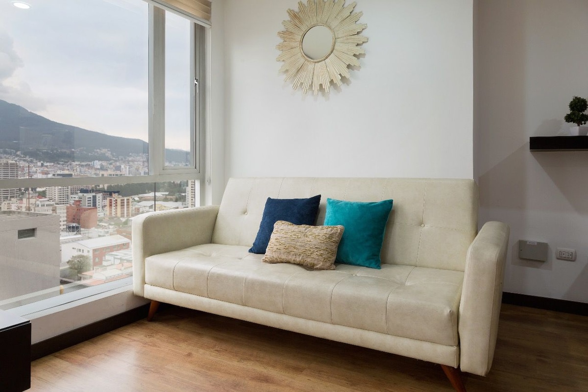 • Powerplant equipped building • 592 sq. ft of private space + guest bathroom • Queen-size Bed • Living room with sofa-bed and table of four. • Fully equipped kitchen • Fully furnaced + SmartTv • Washer + dryer included • Walking distance to amenities: Supermarket, public transport, parks, restaurants and night life. • Security guard/concièrge/intercom - 24/7. • Located at the top floor, great view, few steps away from building terrace (360° view of Quito). • Original Art display
