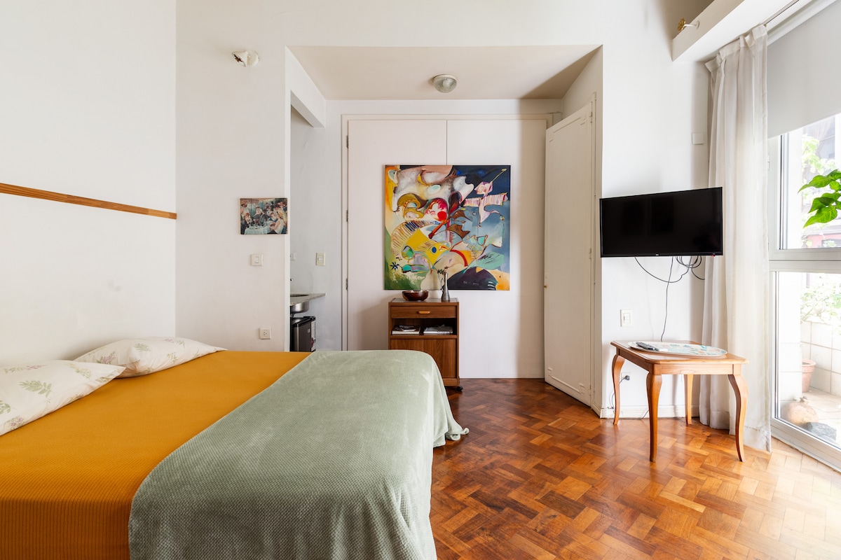 En nuestro calido estudio estarás estratégicamente ubicado para conocer Buenos Aires a pie o en tu viaje de negocios. El departamento silencioso, con todo lo necesario para un confortable descanso luego de un largo dia de paseo o trabajo. Se encuentra en un barrio seguro, con vista abierta y mucha luz. -Check in 14 hs check out 10 - Estancia minima 2 noches In our warm studio you Willy be strategically located yo get to know Buenos Aires in foot or in your business trip.