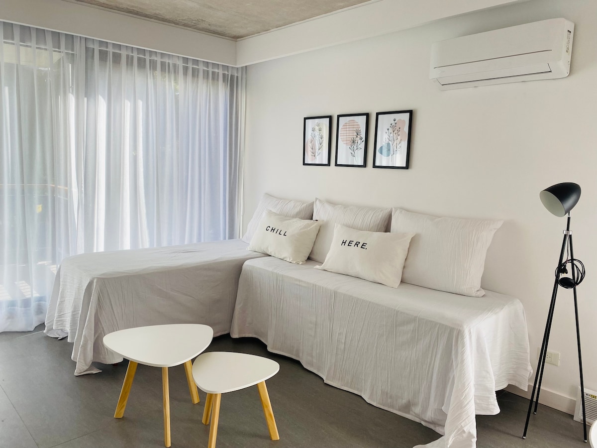 Departamento de 1 ambiente totalmente equipado el corazón de Palermo Soho. Cama super cómoda, ropa de cama, toallas, shampoo, crema de enjuague, jabón, secador de pelo, Aire Acondicionado frio - calor, y mucho más! Zona segura, tranquila y llena de vida: a pasos de bares, restaurantes, farmacias y comercios. Ubicación inmejorable: a solo 250 m de la estación Scalabrini Ortiz (línea D), la más importante de Buenos Aires, con conexión directa a todos los puntos turísticos de la ciudad
