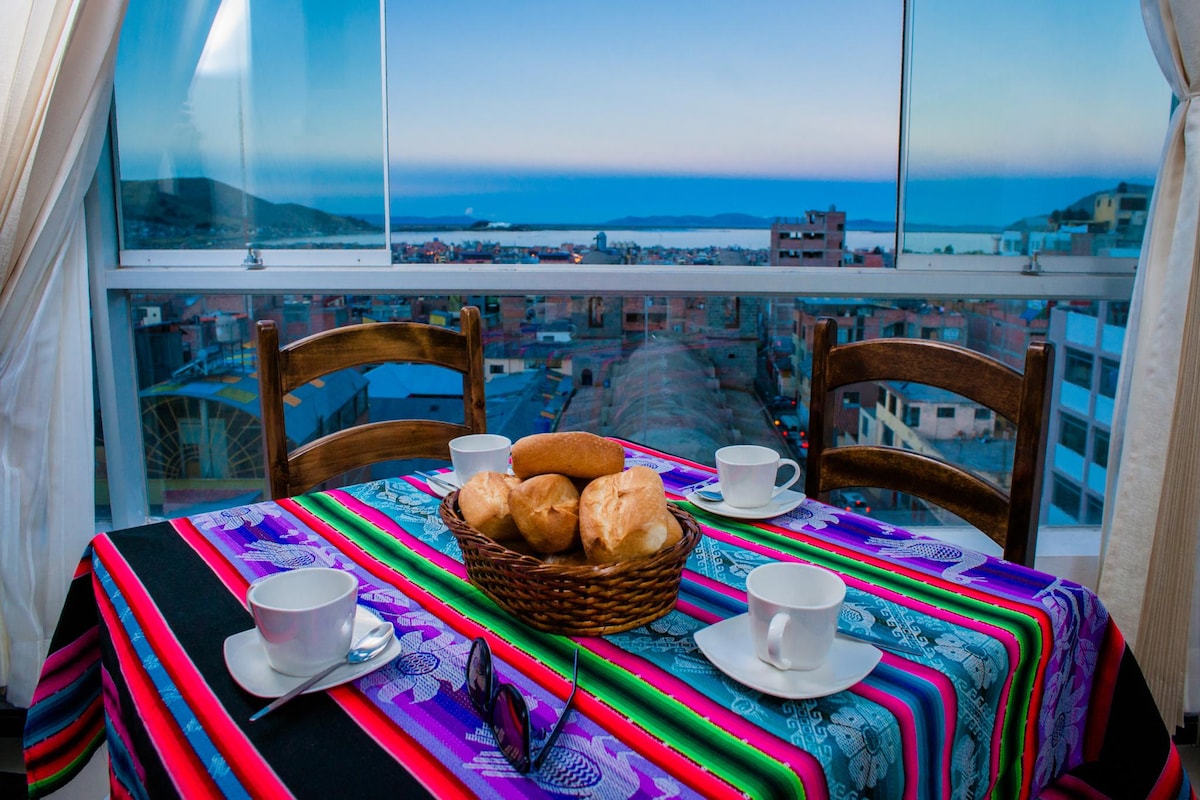 ¡Ven y experimenta en uno de los APT mas altos de Puno!. Ideal para para desconectarse del bullicio del centro, a 15 minutos del centro de la ciudad. Se cuenta con vista panorámica del Lago. Hay ventanas grandes para disfrutar de la luz natural durante la mañana y tarde. Como la propiedad esta en la parte alta de la ciudad, el acceso es a través de una calle en subida . Pero si tiene problemas para llegar, no te preocupes. Nuestro equipo estará listo para ofrecer toda la asistencia necesaria.