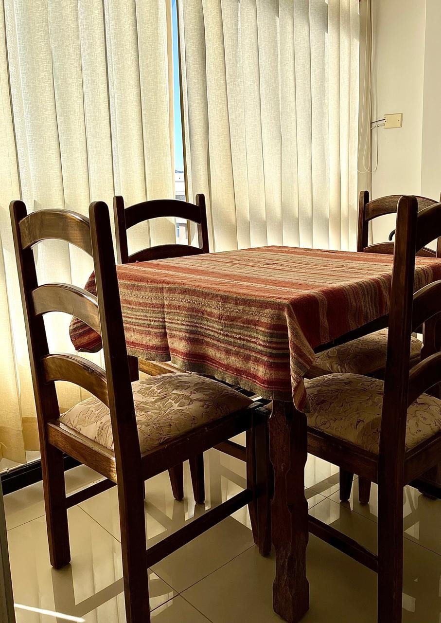 Moderno departamento en estreno a pocos metros de la plaza de armas, equipado completamente con todo lo necesario para que tengas una cómoda estadía en Puno. El departamento está ubicado en un 2do piso ubicado en el centro de la ciudad, zona segura a 2 minutos caminando de la plaza principal y de la calle principal de la ciudad, donde se encuentran los restaurantes y bares de la ciudad. El departamento tiene una cocina completamente equipada y cómodas camas, además de una amplia sala.