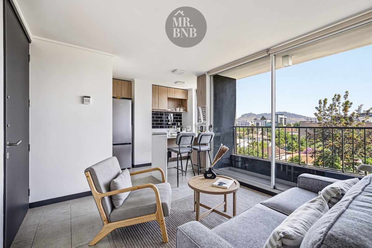 With Air conditioning! Cozy apartment on the 16th floor with stunning mountain views. The suite is equipped with thermal windows to keep you comfortable and has all the comforts of home, making it perfect for your stay. For getting around, it's ideally located: 300 meters from the subway station 110 meters from Plaza Ñuñoa, the heart of the district. This puts you close to public transportation and allows you to easily explore the area's shops, restaurants, and cultural offerings.