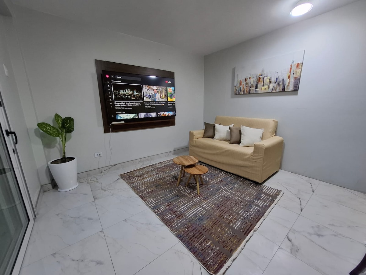 Descansa en nuestro moderno apartamento completamente amoblado y con vista panorámica. Nos encontramos en una bonita zona comercial de la ciudad frente al AELU y a unos pasos de la U. Católica - U. San Marcos y Mall Plaza San Miguel. Contarás con internet WiFi de alta velocidad, Smart tv en la sala y habitación con Netflix, Youtube, canales naciones y de cable. Baño privado con agua caliente las 24h. , cocina implementada con todos los utensilios y ollas, nevera y hasta una lavadora de ropa.
