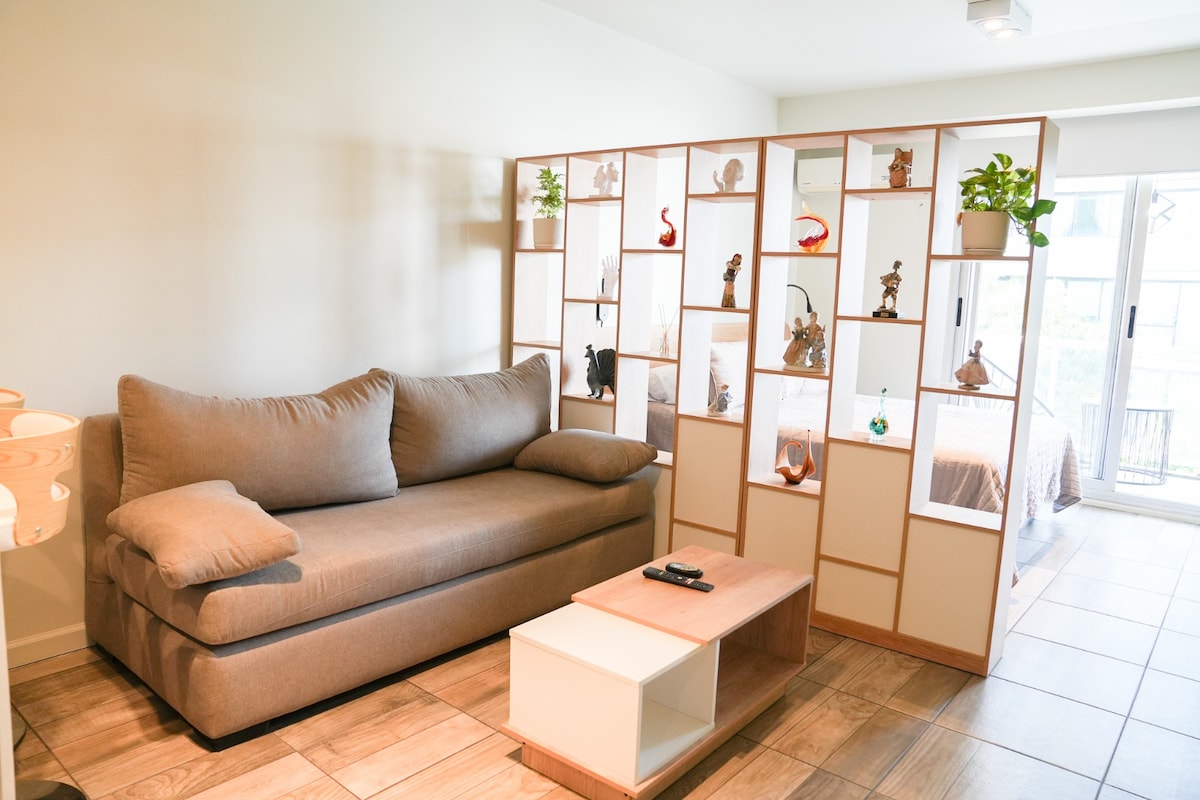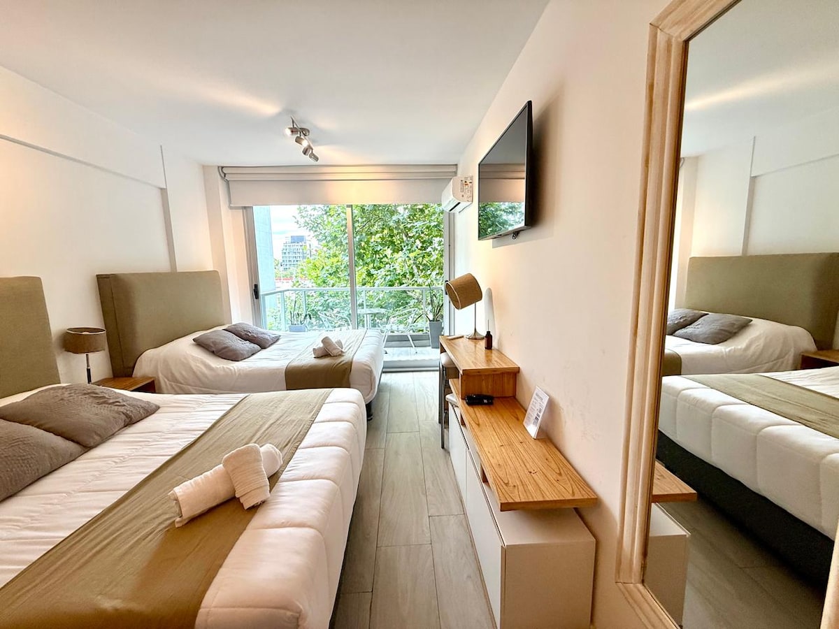 Bright, peaceful, and tastefully designed studio just off Plaza Armenia — the lively heart of Palermo Soho. Enjoy an airy space with fast 500 Mb/s internet, ideal for work or streaming. Remarkably quiet and restful — perfect for deep sleep — with blackout blinds ensuring total darkness. There’s also room for light exercise or yoga, with optional equipment on request. Step outside to cafés, restaurants, shops, yoga, tango and the weekend artisan market.