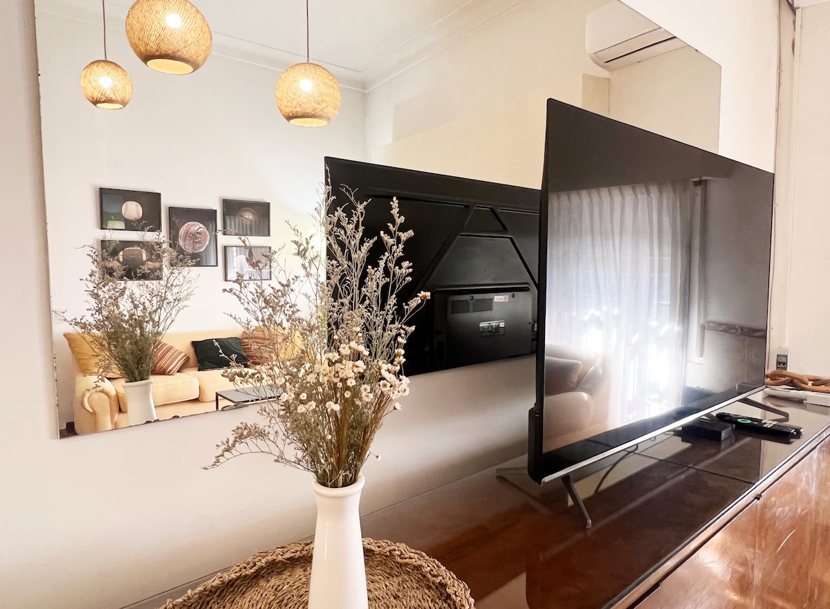 Hola somos Florencia y Gastón, te ofrecemos un departamento 2 hamb. alegre en Palermo Soho (Guatemala y Thames). Dormitorio cama queen re cómoda. Living, mesa escritorio para trabajo remoto. Sillón cama simple. Cocina. Balcón terraza entre los arboles, con mesa y sillas. Internet de alta velocidad para trabajar. Smart TV, chromecast, netflix. secador de pelo, placha, nespresso, licuadora, lavarropas. Todo lo que necesitas. Barrio hermoso. Polo gastronómico y comercial. Plazas lindas y cerca.