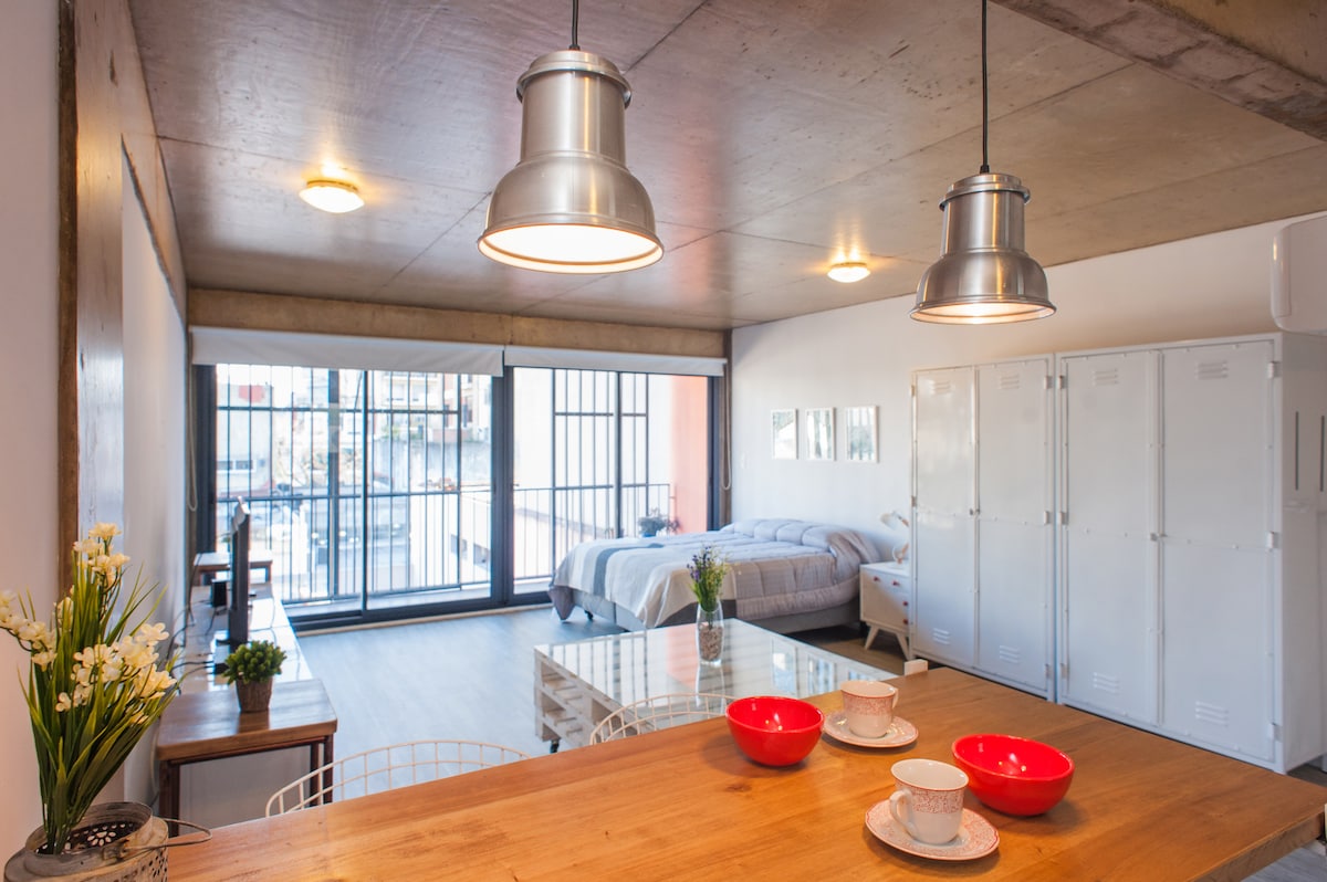 This amazing loft is located in the trendiest neighbourhood of Buenos Aires. It is right infront a lovely plaza called Plaza Armenia. This plaza which is surrounded by trendy bars, shops, has a fountain, and every weeked there are numerous shows! The neighbourhood, palermo soho, is the safests of Buenos Aires so you can be relaxed! The apartment has everything you need for a boheme vacation in Argentina. A fully equipped kitchen, private bathroom, air conditioning, stove, tv, wifi and more