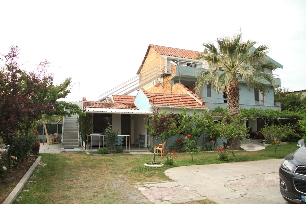 Villa is only 2 min away from the beach by walking, and has plenty shops, market and restaurants nearby. And 5 min walking to the center of Golem. The big yard and the big balconies plenty of trees and flowers and the bird chirping gives you the feeling of peace and harmony because the neighborhood is also very quiet and you can gether with your family and friends.