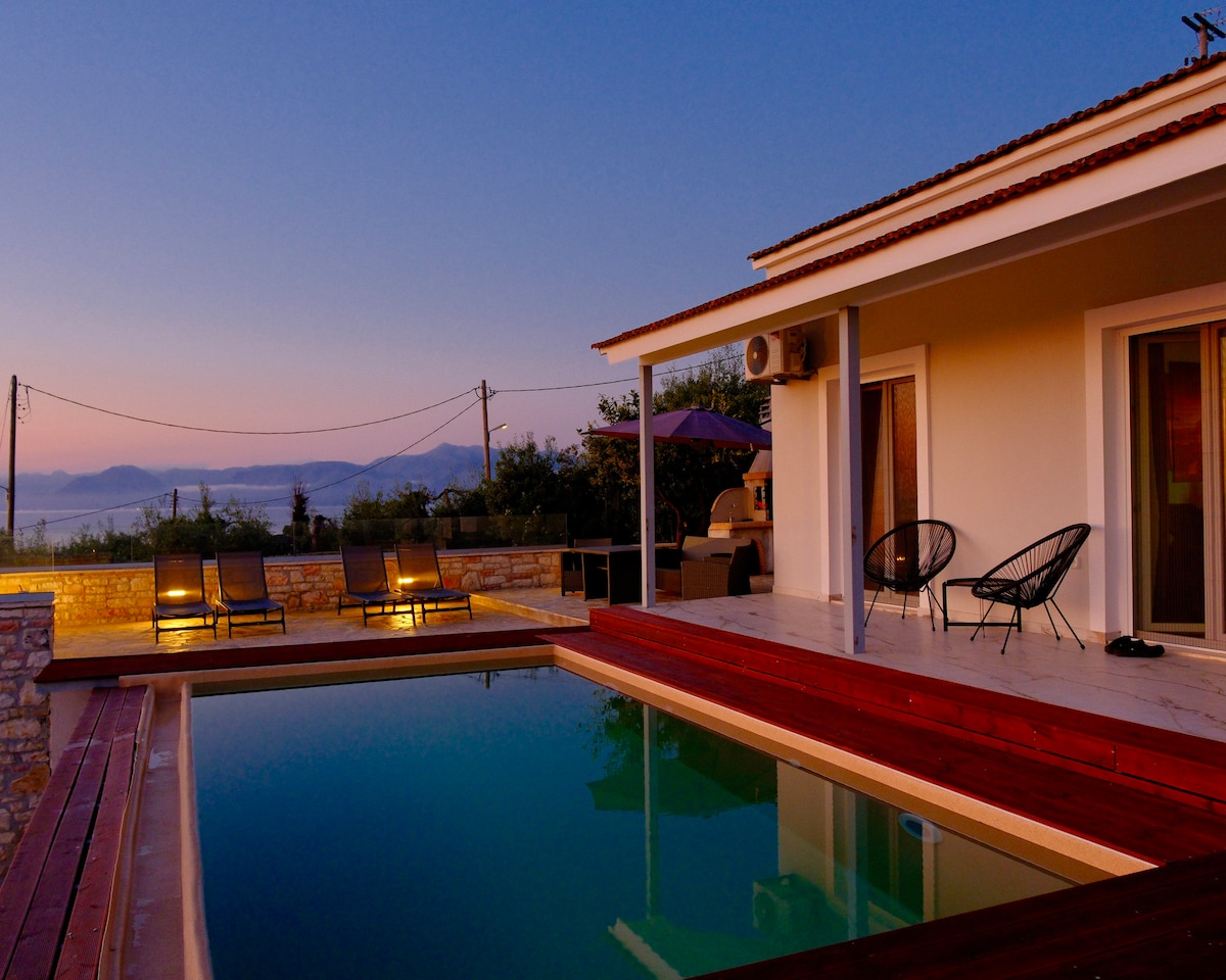Villa Melanthi has luxury in abundance. It sits in an elevated position on a hillside just outside Kassiopi village.The villa is surrounded by carefully designed gardens on different levels with scattered beautiful plants, orange and lemon trees. The infinity pool with its crystal waters is well designed for the convenience of the villa’s guests.The views from here are absolutely breath taking, as the countryside greenery contrasts perfectly with the cobalt-blue of the Ionian Sea.