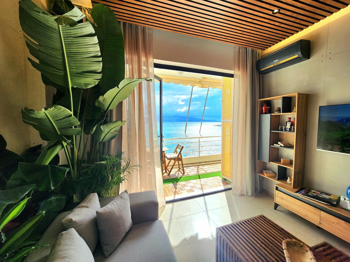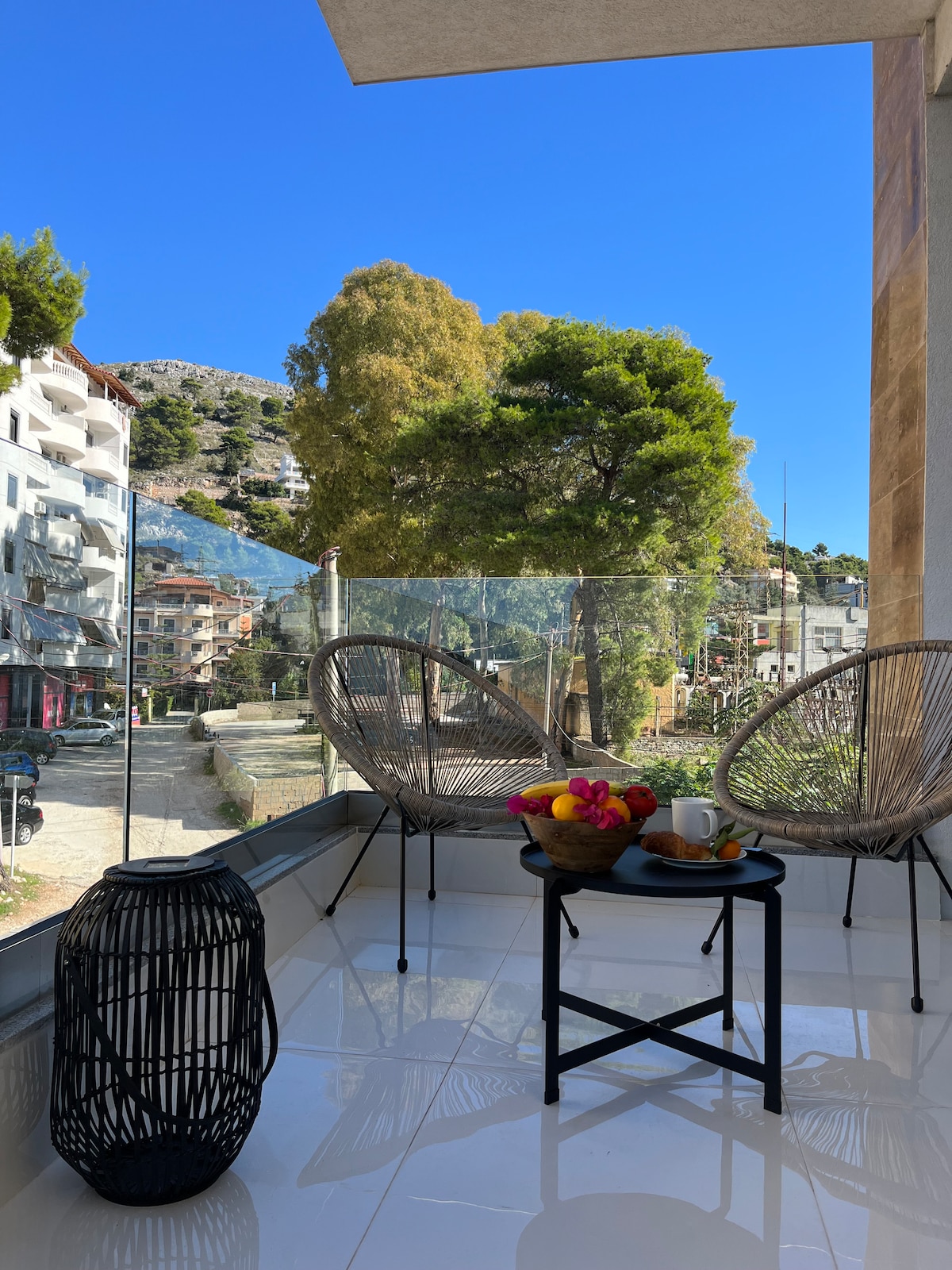 Modern balinese style, with all amenities, the best place in Saranda for couples but even for small families. Centrally located, 3 minutes walk from promenade bar restaurants and the public beach, nearest supermarket 3 minutes walk. Fully furnished, fast Internet 300Mbps. Unbelievable view over Saranda bay and Corfù island.