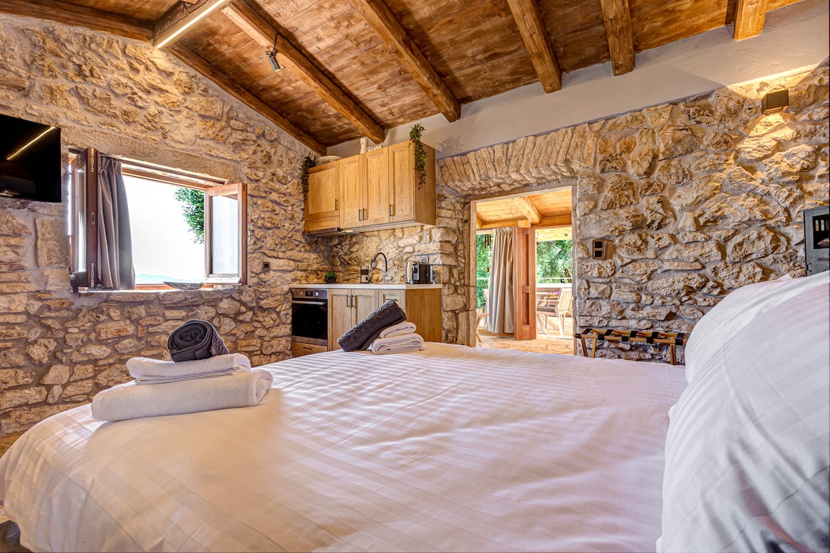 The villa is built on the cliffside and its infinity pool is overlooking the NE bays, the sea and the opposite mountainside. Surrounded by wild nature, the combination of wood and stone (both local) in its architecture make you feel that the villa had been there for ages. Unique decoration with both furniture and details hand crafted. Ample space both inside and outside, a very cute upper pool deck with stunning sea views and an infinity pool and main deck for absolute relaxation.