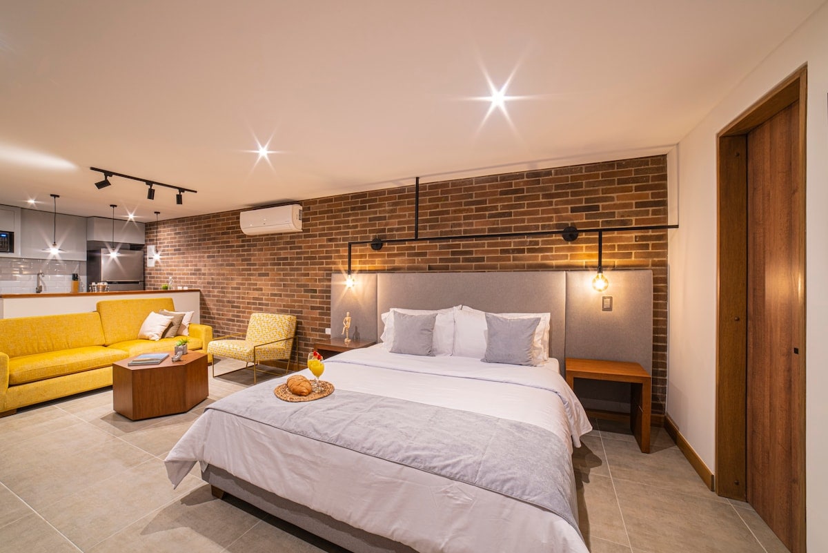 🌴 EXSTR Apartment • ERE Centenario 103 Stay in comfort and quiet just steps from Cali’s iconic Boulevard del Río. This brand-new ground-floor studio faces an internal patio with natural light, giving you peace while keeping you close to the city’s best attractions. Inside, enjoy a spacious European King bed, SmartTV, air conditioning in all areas, fast WiFi, unlimited hot water, and a fully stocked kitchen. Perfect for solo travelers, couples, digital nomads, executives, and medical tourists.