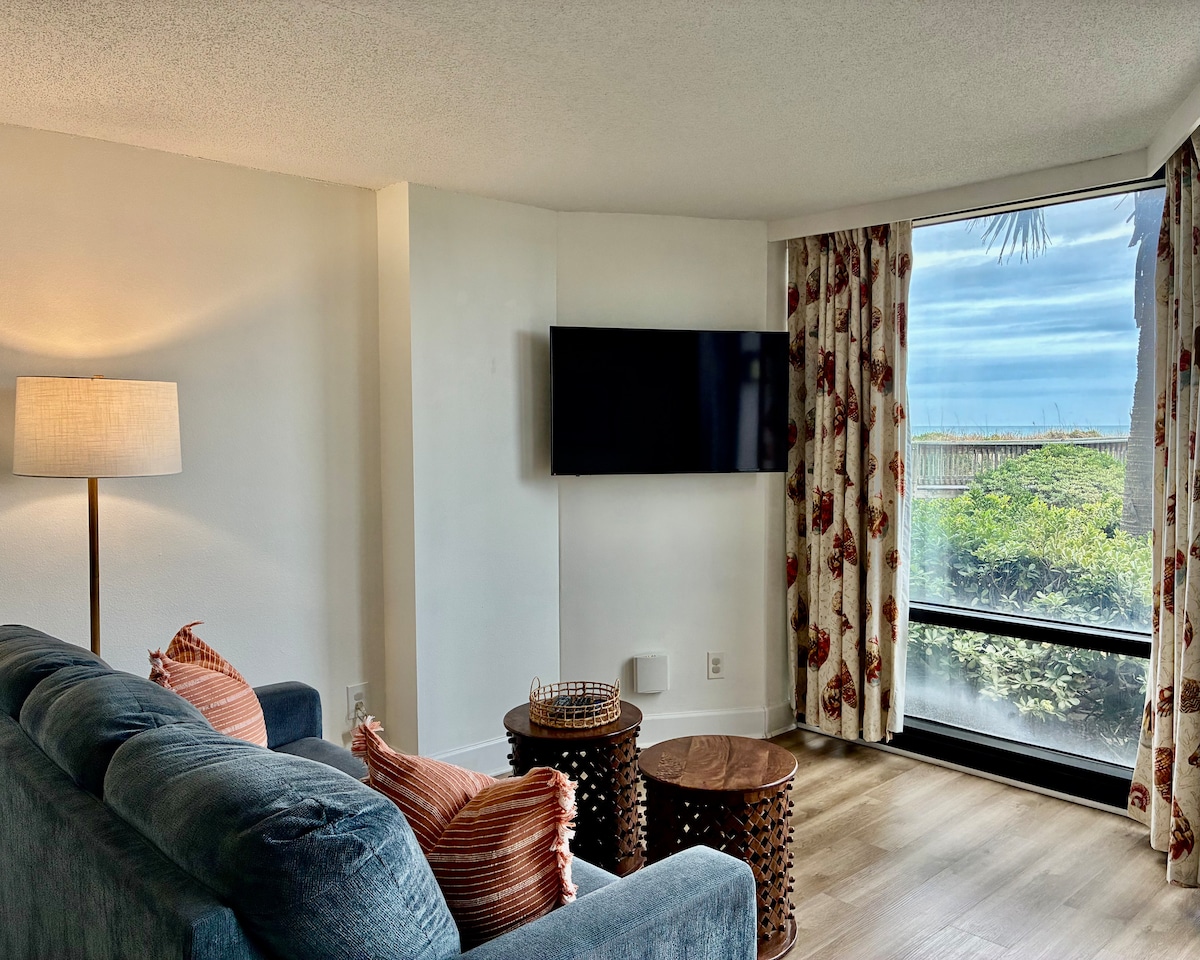 Peach on the Beach is a modern & newly renovated one bedroom condo, with a spacious open living room/kitchen area. This is a corner unit, which provides breathtaking views with access to a large covered oceanfront deck. Just a 2 minute walk to the beach. Perfect location for the sunrise and sunset lovers! Enjoy the ocean sunrise from the deck or beach & directly accross the street at the Fort Fisher Air Force Recreational Center are the best sunsets on the river.