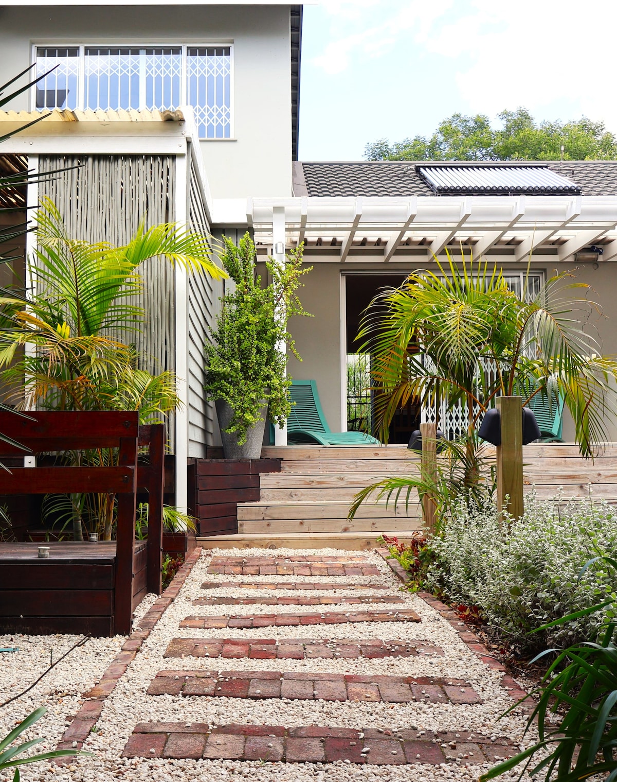 Park House is a recently renovated light-filled designer home shaded by giant milkwood trees a mere 400m from Plett's two main beaches and 200m from a supermarket and several restaurants. Four plush ensuite King rooms are on offer, all set apart from each other and featuring full bathrooms, outdoor showers, percale linen, Wifi and TV. The huge kitchen flows into the dining room, living area and onto the pool patio. In terms of position, quality finish and price, you couldn't ask for more.