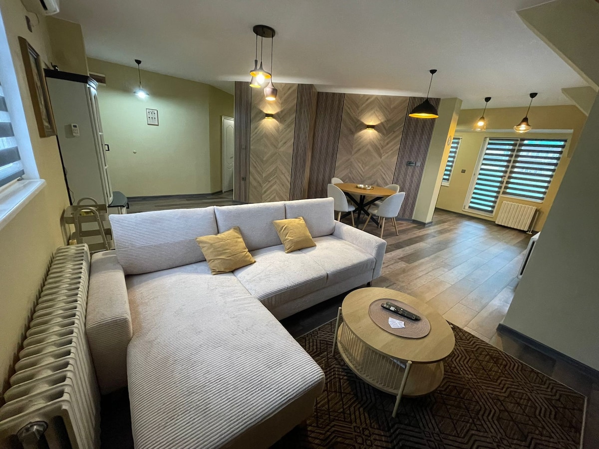 Уютен самостоятелен апартамент в центъра на град Плевен. Апартаментът е с две големи спални, голяма всекидневна и кухня, баня с тоалетна и две големи тераси. Намира се на 5 минути пеша от центъра и на 5 минути пеша от Медицински Университет Плевен. Апартаментът разполага с обособено място за работа, напълно оборудвана кухня, климатик и конвектор, телевизор и Wi-Fi, хладилник, печка, пералня и кърпи! Това специално място е близо до всичко, което улеснява планирането на престоя ви!