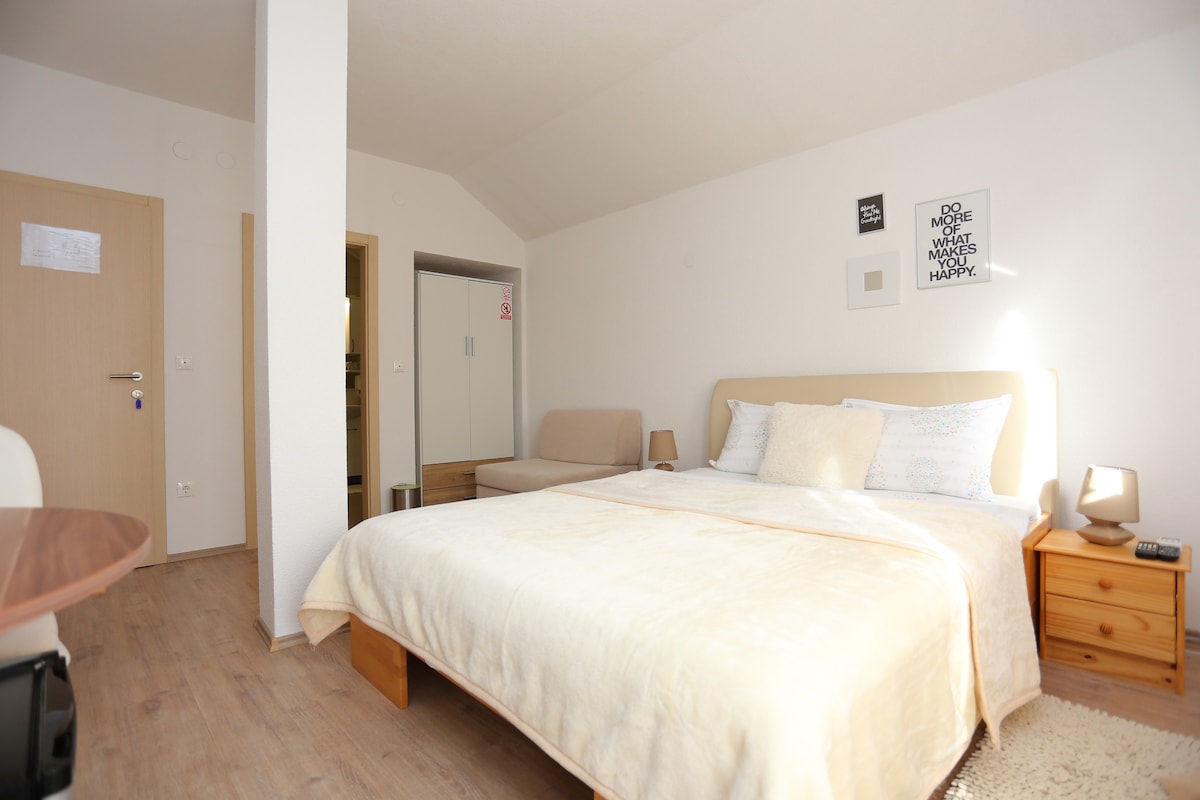 Luxuriously furnished studio apartment A3 with double king size bed and single bed, fully equipped kitchen, bathroom, balcony looking toward the villa's garden. Apartment A 3 is accommodation in new-build Villa Majestic, in peaceful and charming environment. It is equipped with flat screen TV, air conditioning, refrigerator, oven, stove, minibar, kettle, free WiFi, dishes, cutlery, linen, towels, slippers, hygienic kit.