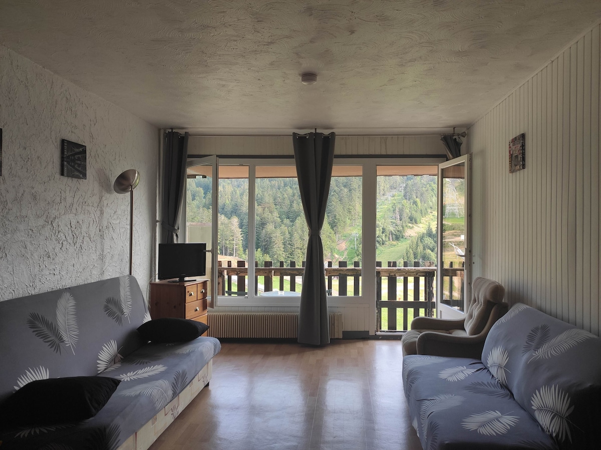 40m2 exposé Sud-Ouest : entrée, séjour cuisine, double-loggia vitré avec canapé, 1 chambre, lit double, simple, gigogne, 1salle de bain Idéal de 1 à 3 pers, poss 5 Situé dans une résidence très calme du secteur arboré Rocher du Cerf, à proximité des sentiers de rando-trails, 200m des pistes de ski/Vtt >Place de parking privée les moins du lieu : > Pas de cafetière > Draps et serviettes non fournis Pas de supplément ménage mais je vous serais reconnaissante de laisser l appart rangé etpropre