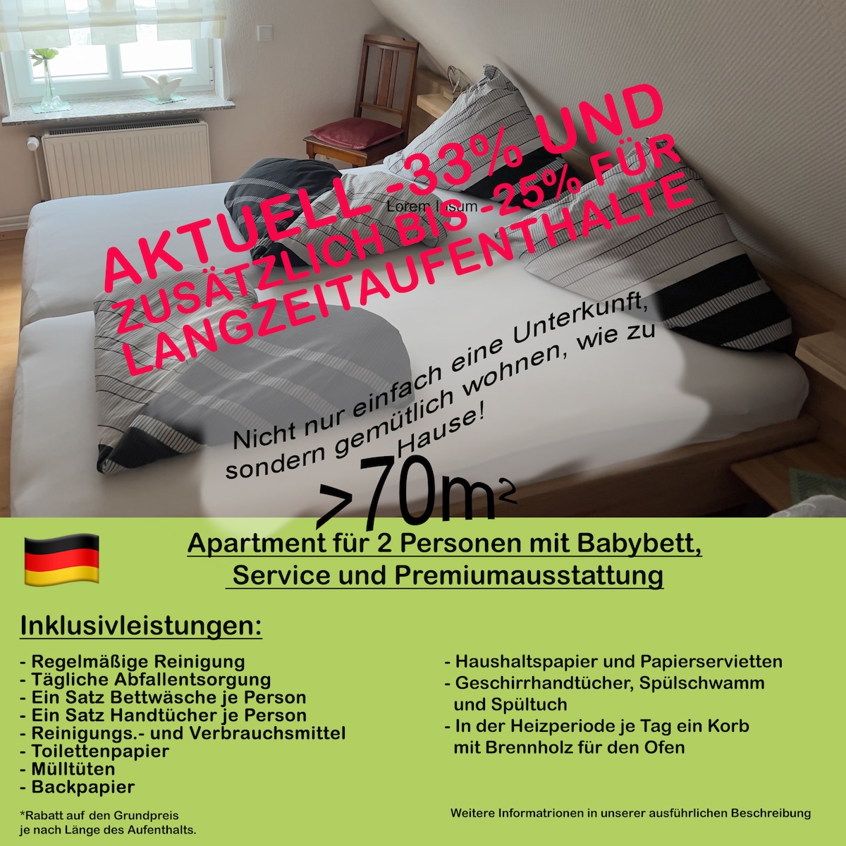Urlaub von der ersten Minute an. Das ist unser Motto und wir schaffen die Rahmenbedingungen dafür:) Seht euch die Bilder in Ruhe an und lest die Unterkunftsbeschreibung durch. Ab den 3. Gast erhöht sich der Preis um 5 Euro. Keine versteckten Zusatzkosten für Handtücher, Bettwäsche, Reinigung. Die Gemeinde Schönberg erhebt eine Kurtaxe. 1,50 / 3,00 Euro pro erwachsene Person/Übernachtung. Diese zahlt Ihr bei eurer Ankunft bei mir. Beachtet dieses bei eurer Buchung. Fragen? Schreibt uns !