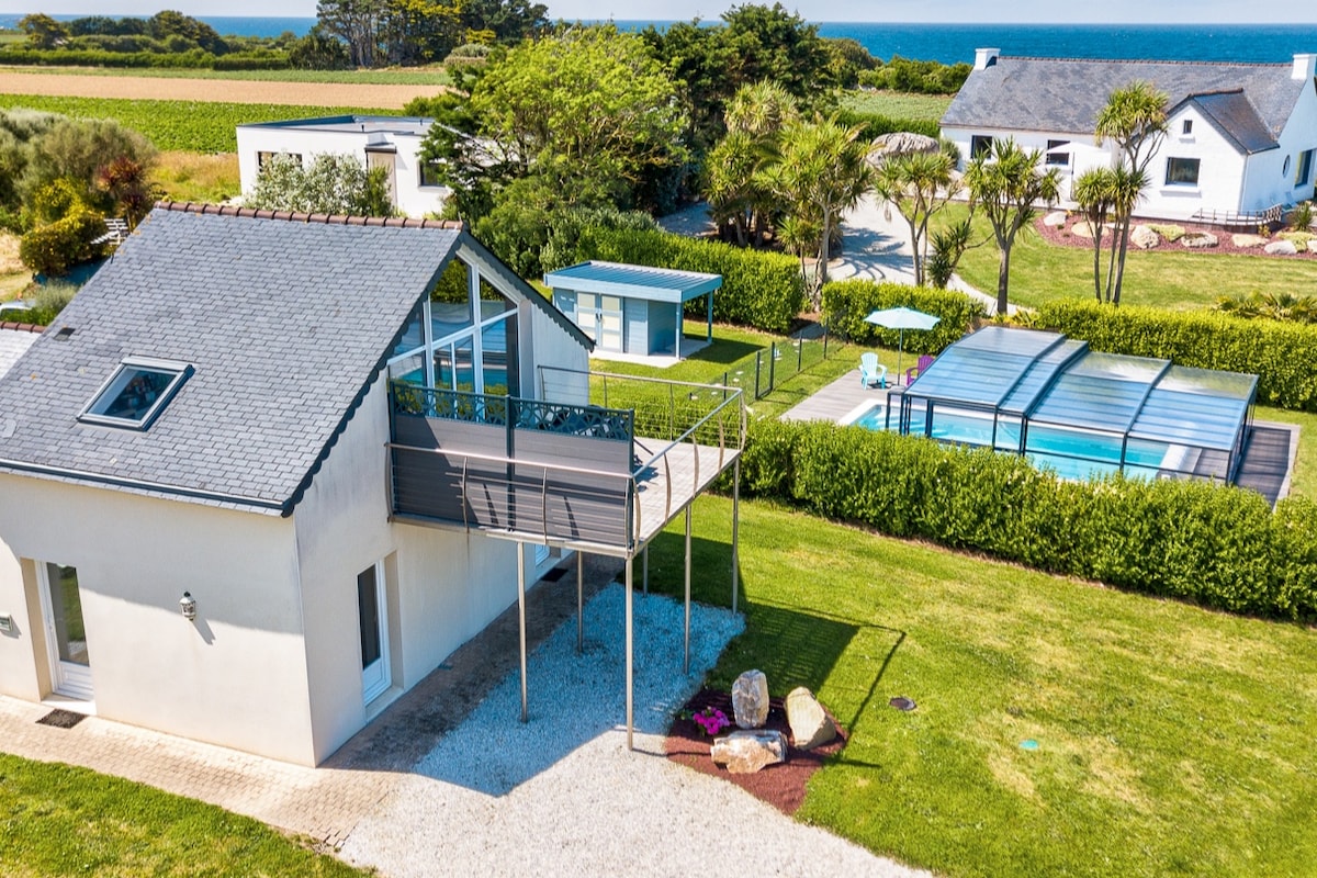 Villa spacieuse de standing avec sa piscine contigue, couverte, chauffée est située à 150 mètres de la plage de Poulfoen . Le site de Kerfissien plage est à 200m avec son bureau de tabac et son dépôt de pain, son petit port de pèche local, son marché estival les dimanches matins avec toutes les spécialités de notre Bretagne! Lieu de villégiature très apprécié de tous bordant le fameux GR 34 prisé des randonneurs. Nous accueillons jusqua 12 personnes sur demande speciale