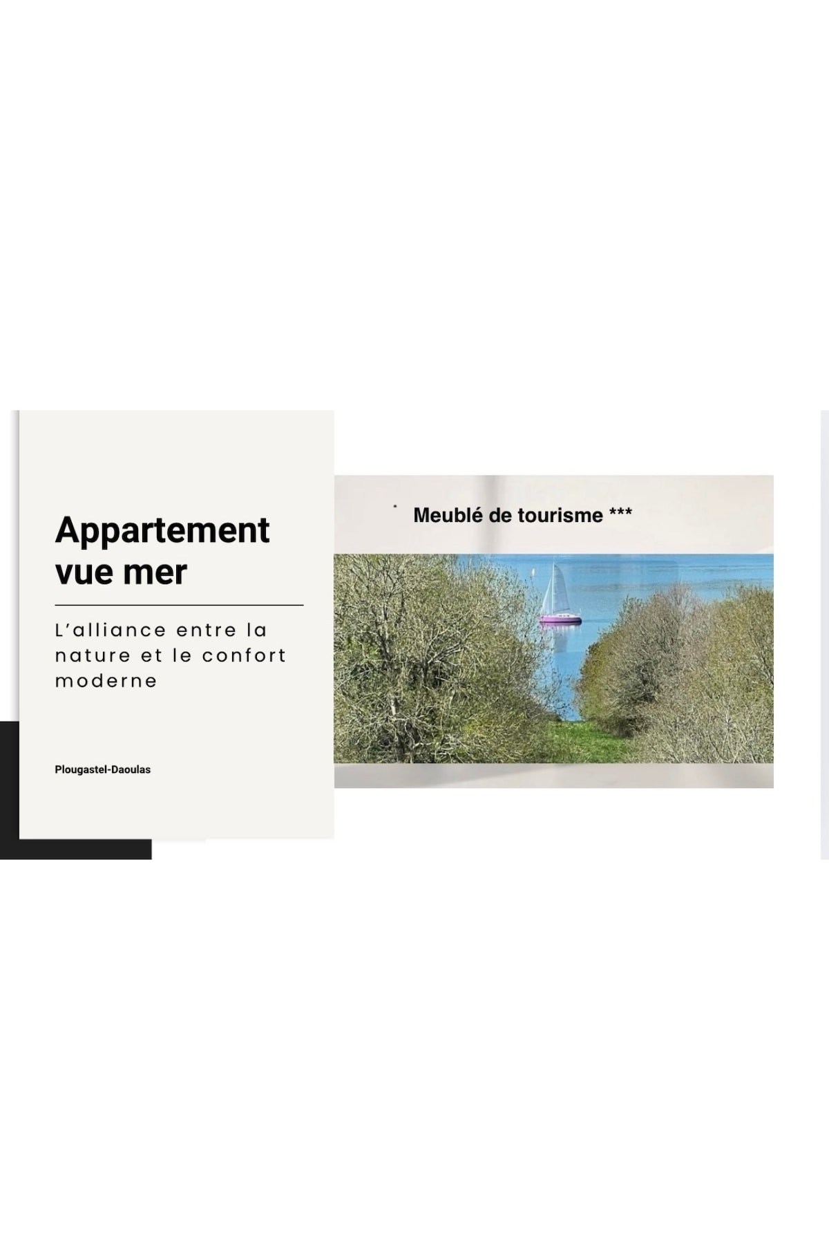 Rêvez-vous de séjourner dans un cadre apaisant alliant confort et nature ? Dans un village au calme, cet appartement vue mer de plus de 70m2, au rez-de-chaussée d’une maison d’architecte, de haut standing, divisée en 2 appartements, est fait pour vous ! À proximité immédiate de la ville de Brest, d’une grève, de la chapelle St Jean, d’une forêt, d’un sentier côtier … Pour les curieux de la faune, il n’est pas rare d’apercevoir de la fenêtre : chevreuils, renards, faisans …