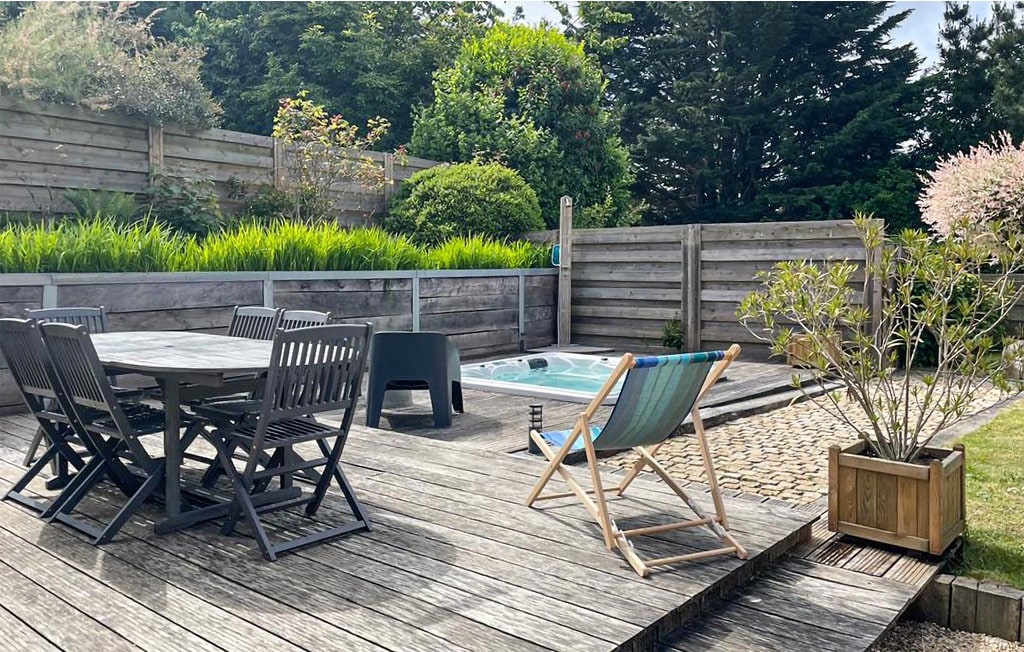 Gite au rdc d'une residence Cuisine aménagée avec accès terrasse couverte d'une pergola, salon vue mer canapé lit en 140 , une chambre lit 160, salle d'eau, wc séparé. Parking et entrée indépendante avec portail électrique. Jardin privatif clôturé, jacuzzi privatif couvert 4 places en extérieur. Profitez-en en famille ou en amoureux après une longue journée... Proximité commerces, 700m du port, des plages et du marché hebdomadaire. Proche des sentiers de randonnée et du GR34.