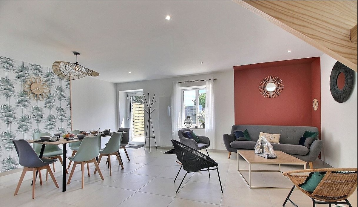 Ici, vous êtes en vacances au bord de la mer, à 800m des plages. Descendez à pied à la plage du Moulin ou celle des Godelins par le sentier de bord de mer. Le centre-bourg, à 200m, vous donne accès à tous les commerces. La maison est un havre de paix, nous l'avons rénové avec des matériaux naturels et sains. Le salon, baigné de lumière, est ouvert sur la cuisine et le jardin pour vos barbecues d'été.