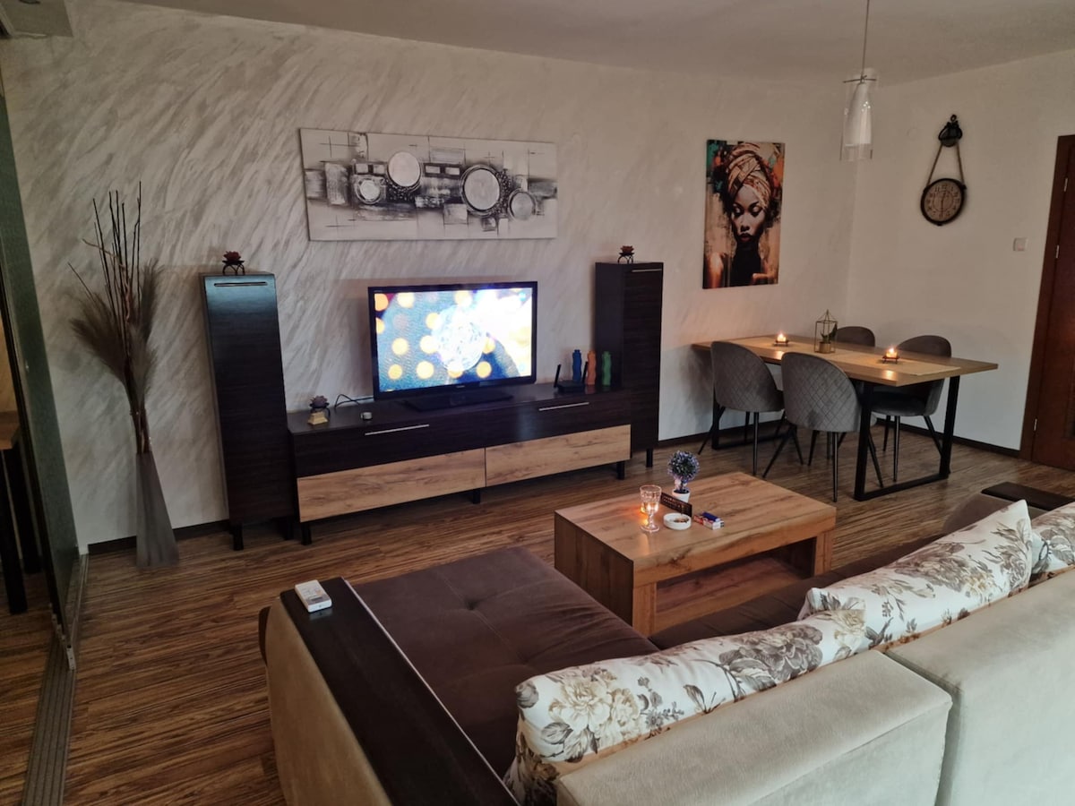 Cozy apartment in the center of Plovdiv.Perfect location,3 min walk away from main train station and bus stations,next to city garden and main street of the town.Free Wi-Fi and cable TV.Living and dining room, bedroom,equipped kitchen and big terrace.