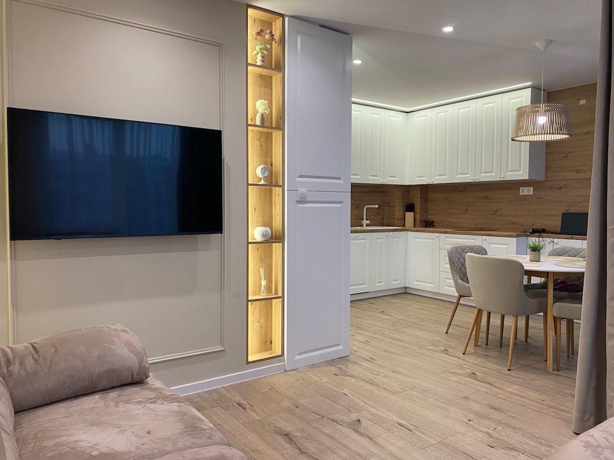 With a completely modern look, our one-bedroom apartment is now ready to welcome you! The elegant interior is carefully chosen to make you feel just like at home. The flat is fully equipped with everything you need either for your short or long-term stay. At your disposal is also a parking spot. Strong Wi-Fi connection is covering the entire property. The space is disinfected according to the Flat Manager Sanitary Standards.