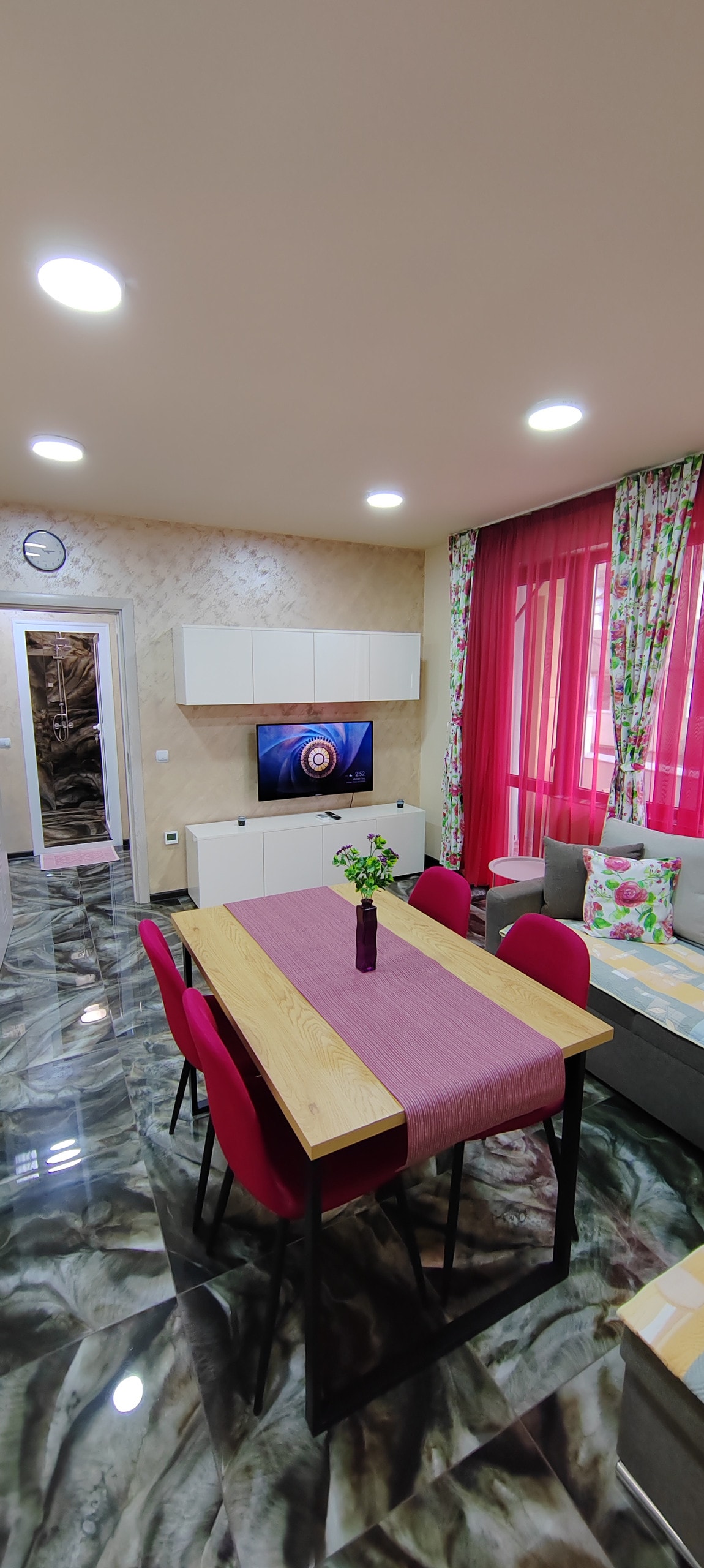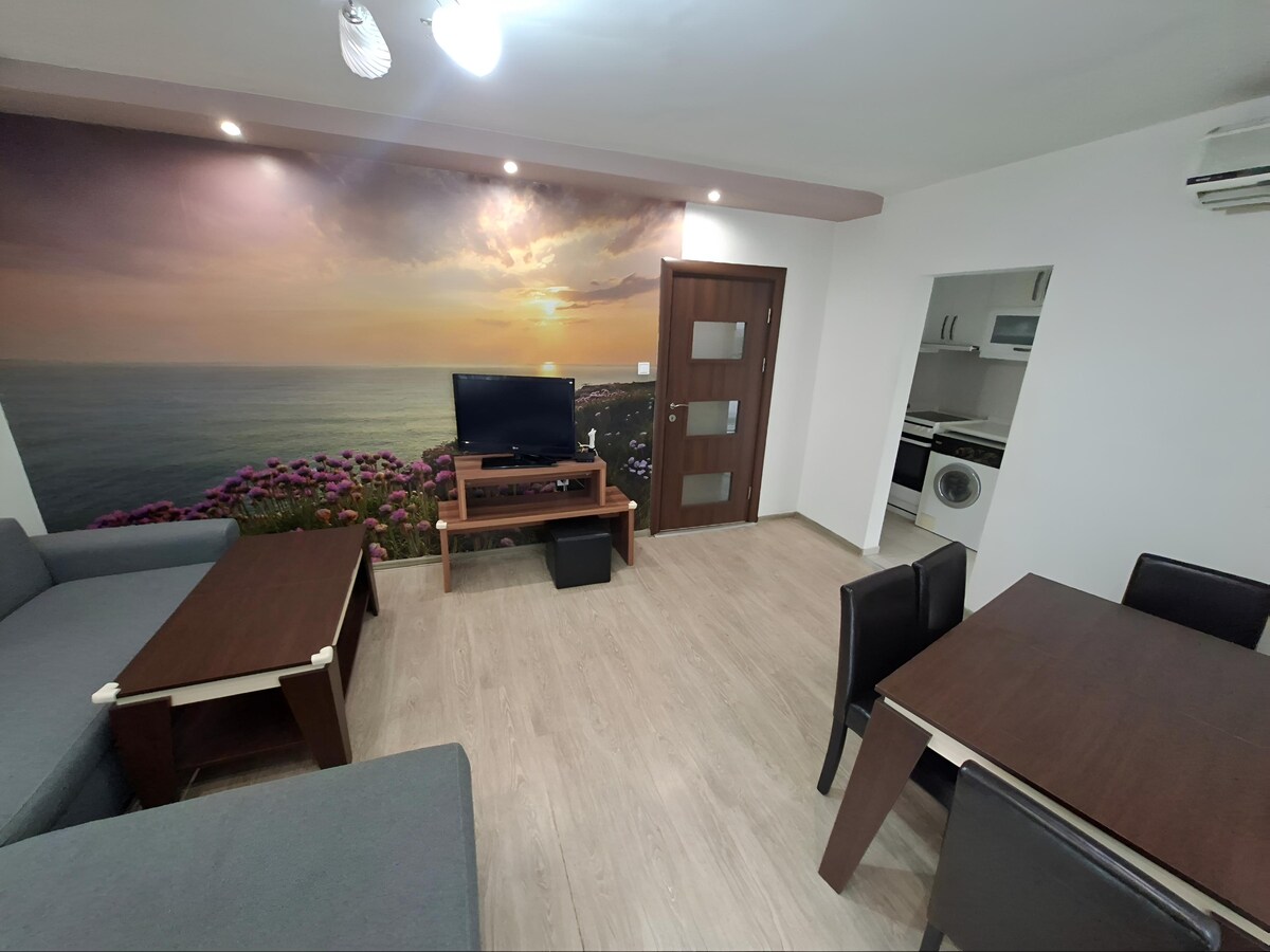 The apartment is in a brand new building. It is air-conditioned and equipped with everything you need to feel like home, including kitchen appliances, beautiful linen and fresh towels. As a compliment - Free parking area! Апартаментът е разположен в нова сграда, в тих и спокоен квартал. Той е лиматизиран и оборудван с всичко необходимо, за да се почувствате у дома, включително с кухненски уреди, красиво спално бельо и хавлиени кърпи. Като комплимент към гостите, предлагаме безплатен паркинг.