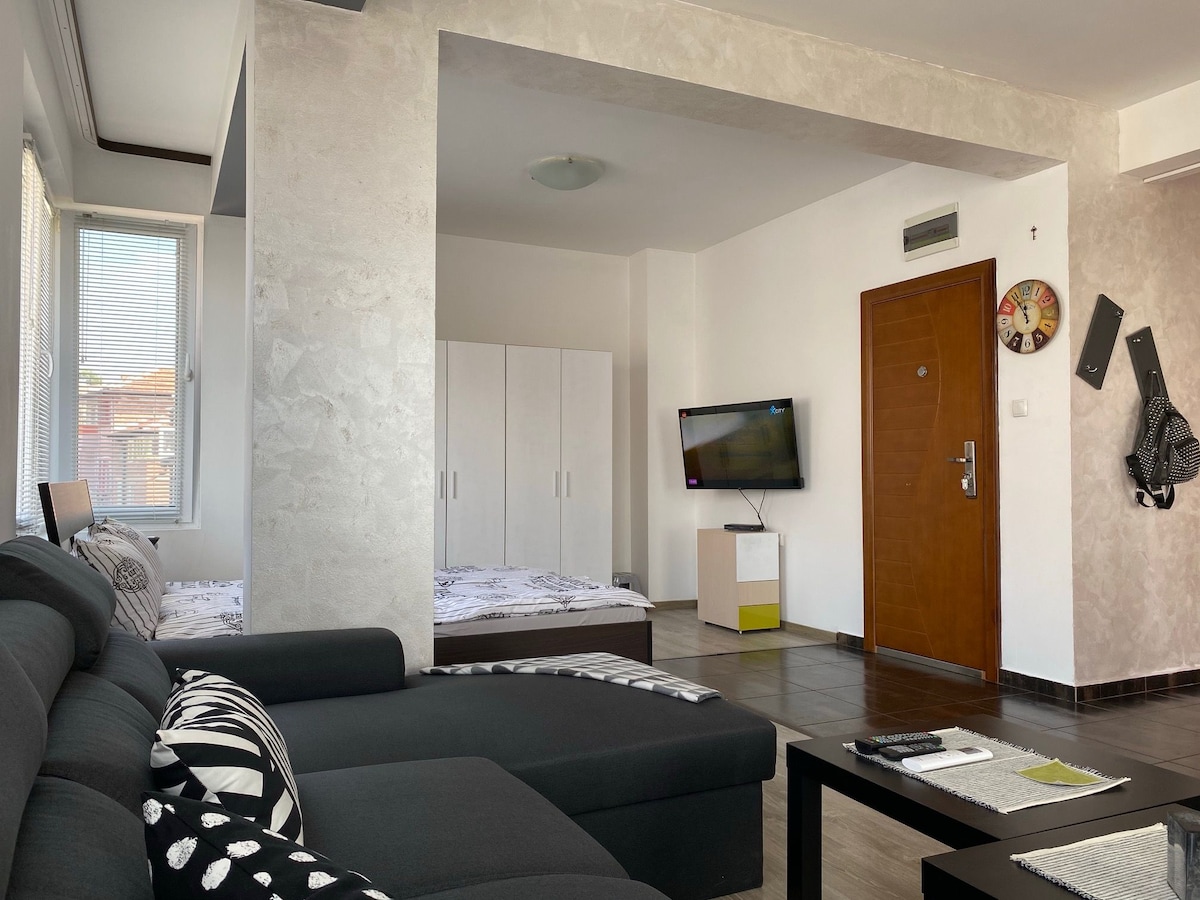 Welcome to my brand new and cosy place, designed with a lot of love,care and thought so you can haver a truly relaxing stay in Plovdiv. The building is just in front of the International Fair Exibition, just a short walk to the City Center across the beautiful Maritza River. The neighbourhood is really lively, communicative and safe. I will be happy to meet you and accomodate you personally, so you will immediatelly feel as an old friend who came to visit :)