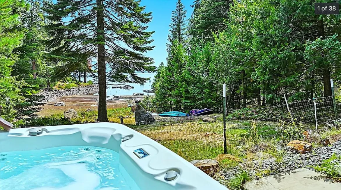 Lakeside lawn, swimmable cove, hot tub, kayaks, beach chairs, and a shared dock when lake levels allow — this is a proper Lake Almanor summer. Five bedrooms, two full kitchens, sleeps 10. Made for two families traveling together: cook simultaneously, spread out, and actually relax. Dogs welcome. The cove is calm and shallow, safe for kids. Bring your boat and tie to the buoy. Chester dining and Bailey Creek Golf are minutes away. Restaurants are within walking distance.