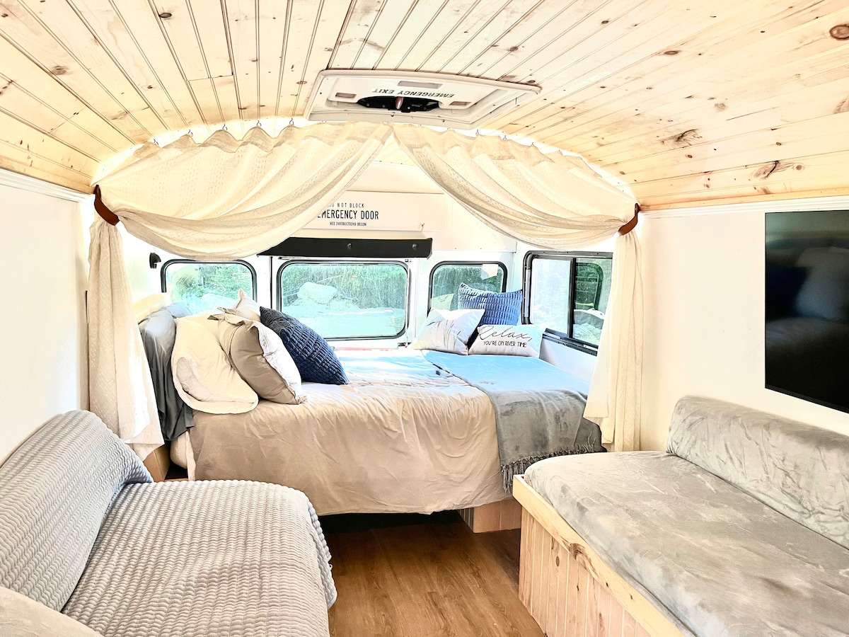 Escape to nature and unwind in our cozy, converted school bus nestled on 10 acres along a quiet basin of the Pemigewasset River in New Hampshire's scenic Lakes Region. Hiking and mountain biking trails, a whitewater kayaking park and disc golf are all available within 2 miles. Whether you're seeking adventure, serenity, or a unique getaway, this charming schoolie offers the perfect blend of rustic comfort and modern amenities.