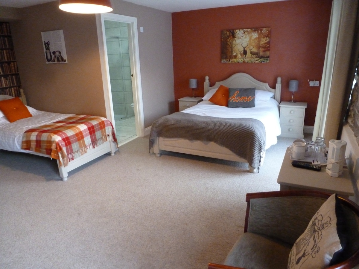 The Kil Margh Room at The Rising Sun Altarnun is a charming escape in Cornwall. Relax in the king-sized bed, watch TV, and use the dressing table with a Nespresso machine. The modern en-suite has a spacious walk-in shower. The location is an ideal base for exploring Bodmin Moor, perfect for hikers and cyclists.
