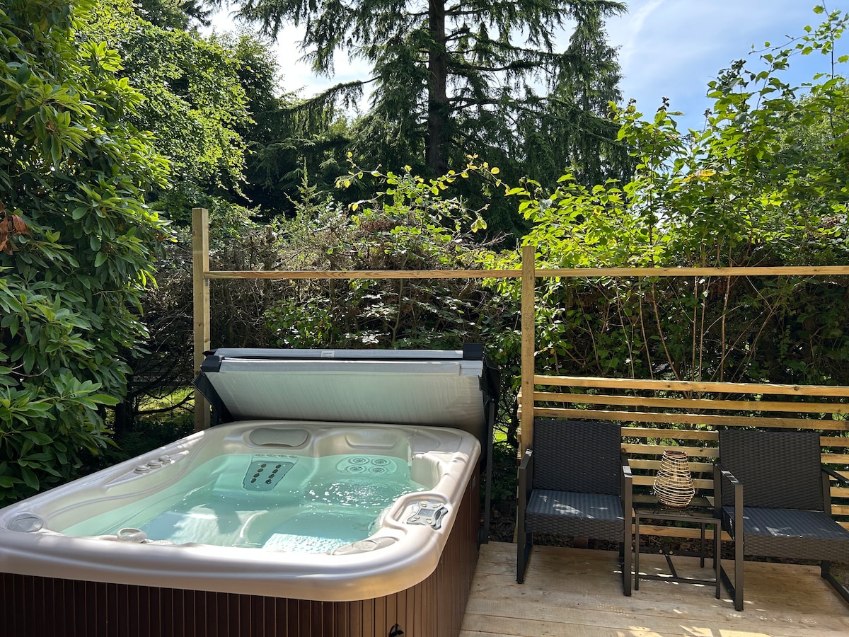 The private hut has a covered area for hot tub/deck area, towels & dressing gowns. A fully equipped kitchen, shower room & toilet, small double bed, log burner, heater. Bedding, towels, toiletries, hot beverages, local milk. Full english breakfast ingredients for first morning,pre booked with 24hrs notice needed, seating area looking out onto woodland, fire pit, bbq. Woodland walk on the door step, 20 mins Cornish border, Okehampton, Launceston & Dartmoor, 25 mins north coast, A30 is 10 mins.