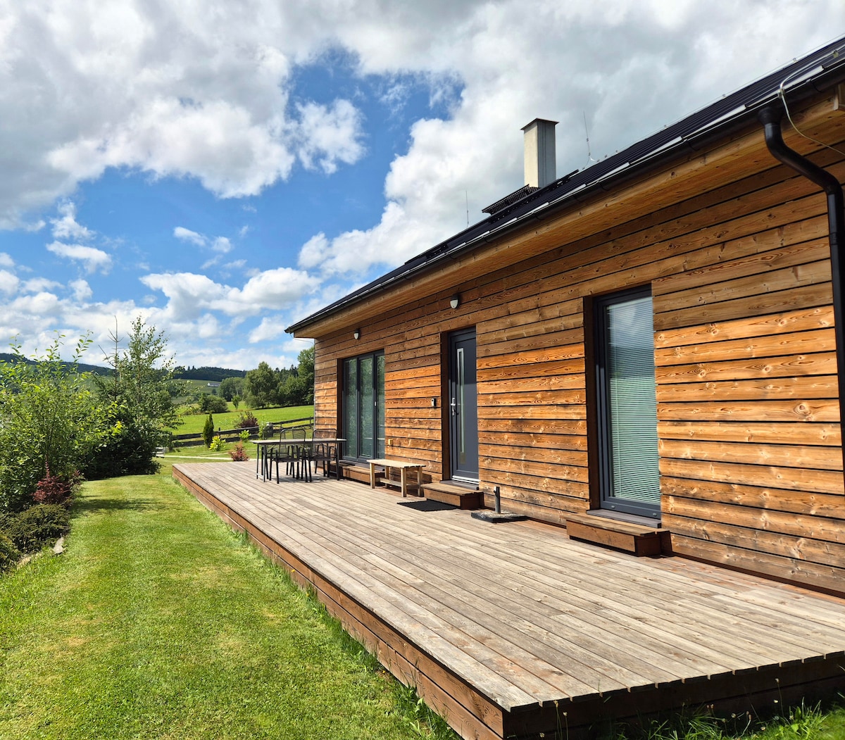 Rent a cottage in the Bohemian Forest, two kilometers from the ski area Zadov. Beds are divided into 3 apartments, two apartments have a bedroom with a double bed and a room with three beds, the third apartment has a bedroom with a double bed and a room with two beds. Each apartment has its own bathroom with shower and toilet. There is also a covered terrace, a large garden with its own forest, covered parking for 3 cars, bicycle and ski storage, smart TV and Wi-Fi.