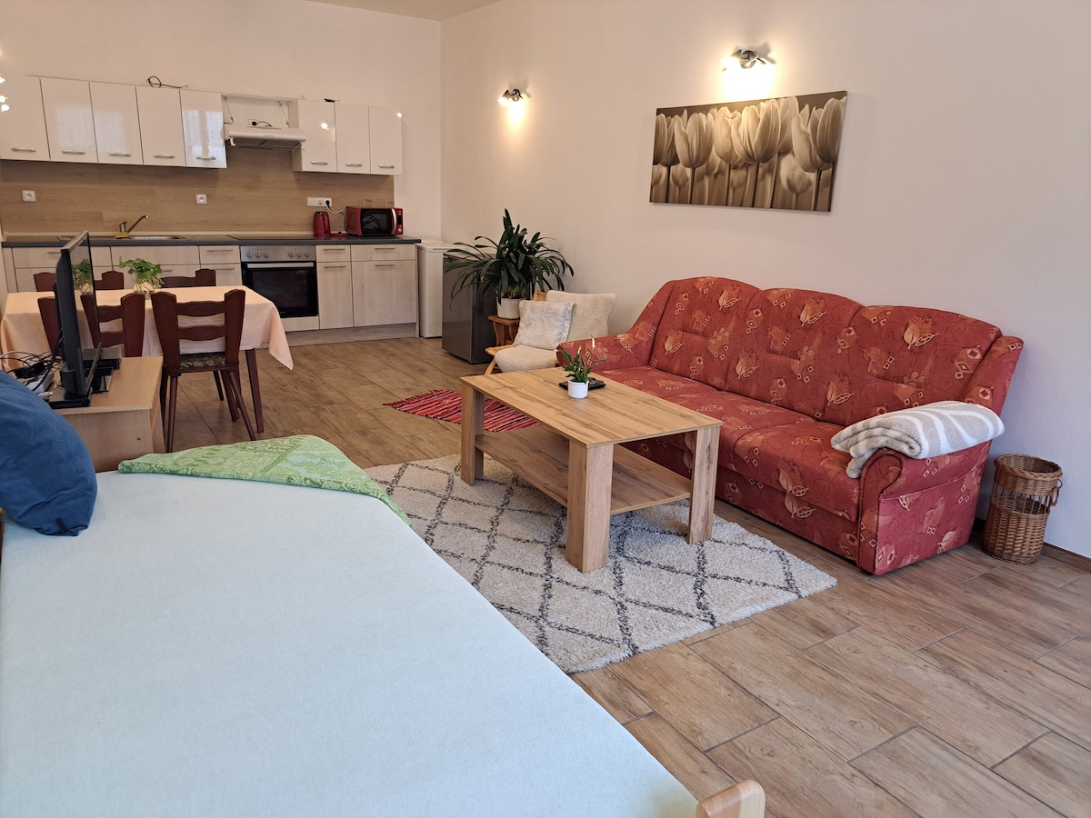 Unsere große Ferienwohnung liegt auf dem historischen Mühlenhof Vodolenka – mitten in der Natur, absolut ruhig und perfekt für alle, die Erholung suchen. Auf ca. 100 m² gibt’s Platz für bis zu 5 Personen, mit Kamin, Sauna und Whirlpool zum Entspannen. Das Highlight: Rotwild direkt vorm Fenster, viele liebe Hoftiere, ein eigener Angelteich, Grillmöglichkeit im Garten und kostenlose Leihfahrräder. Ideal für Familien, Naturfans und alle, die einfach mal durchatmen wollen.