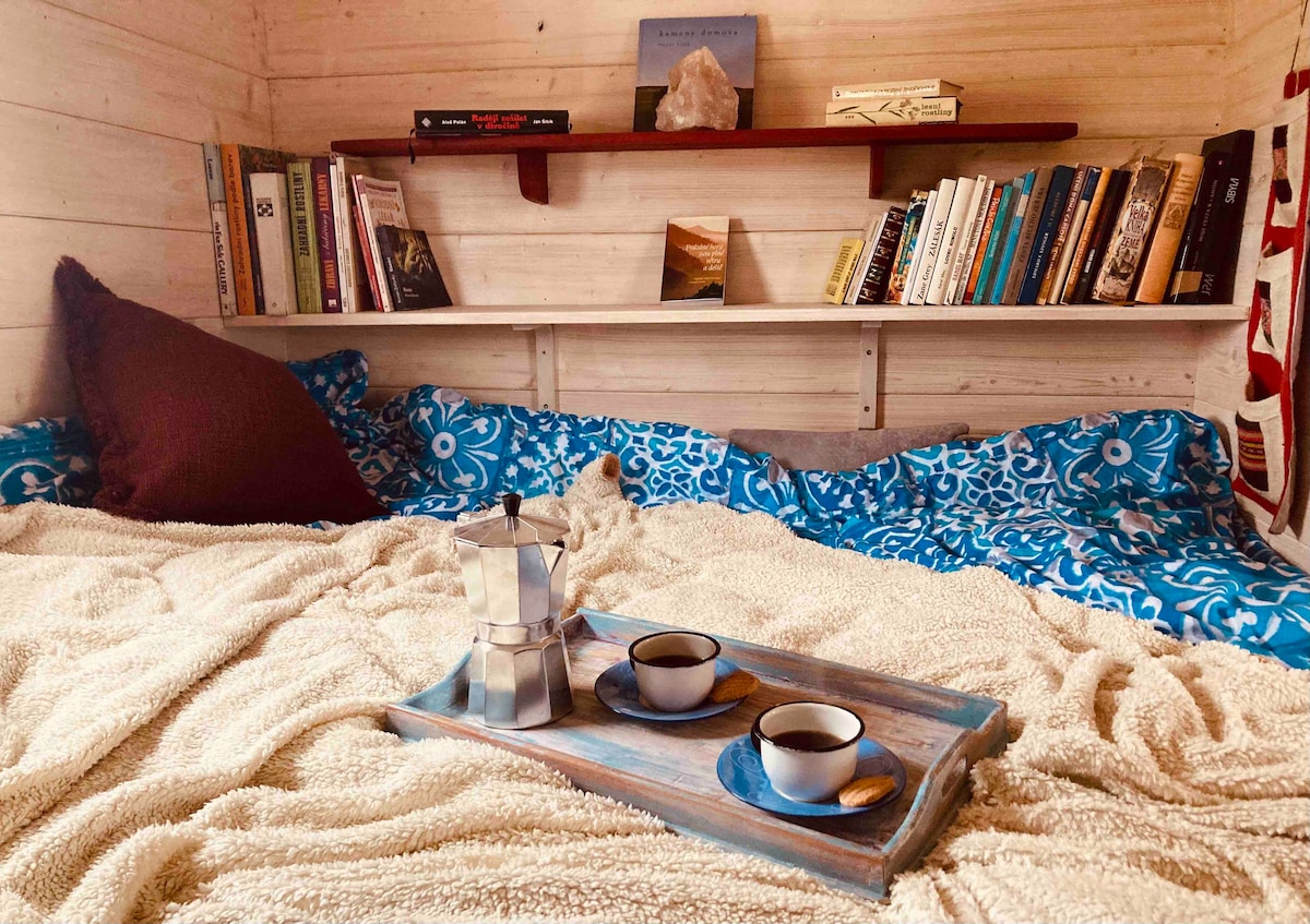 Pobyt v naší maringotce je DobroDružství, uzdravující osvěžení a dovolená s úžasným západem slunce. Maringotka je na oploceném pozemku v CHKO Brdy. Nachází se v nezastavěné části obce, poblíž našeho domu, všude kolem jsou pastviny, takže žádná stříkaná pole. Na pastvinách stádo krav a ovcí a před vámi krásný výhled až na Šumavu. Pitná voda k dispozici. Dřevo na oheň je v ceně. Tadle maringotka je naše dřevěné srdce, které jsme sami zrekonstruovali. Je to prostě jiný, úžasný pohled na svět.