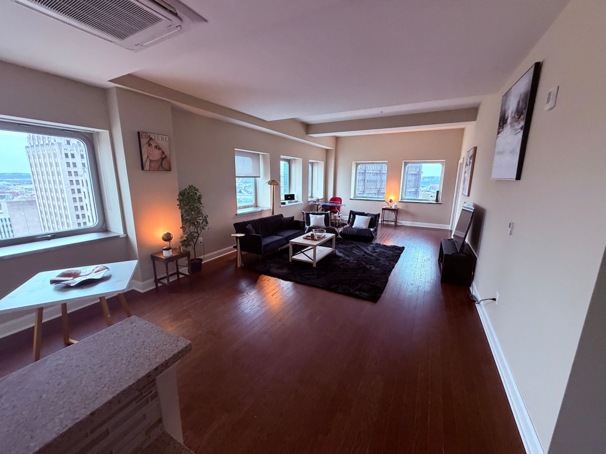 Experience downtown Pittsburgh from this newly renovated double king suite! Step outside and you're surrounded by Pittsburgh's best restaurants, shops, steps away from the Convention Center, theaters, and more. Designed for comfort and convenience in an unbeatable location! -2 King beds - In-unit washer & dryer - Walk to everything - Multiple garages within 5 min - 24/7 guest support Perfect for business trips, events, or weekend getaways. We're here for you before, during and after your stay!