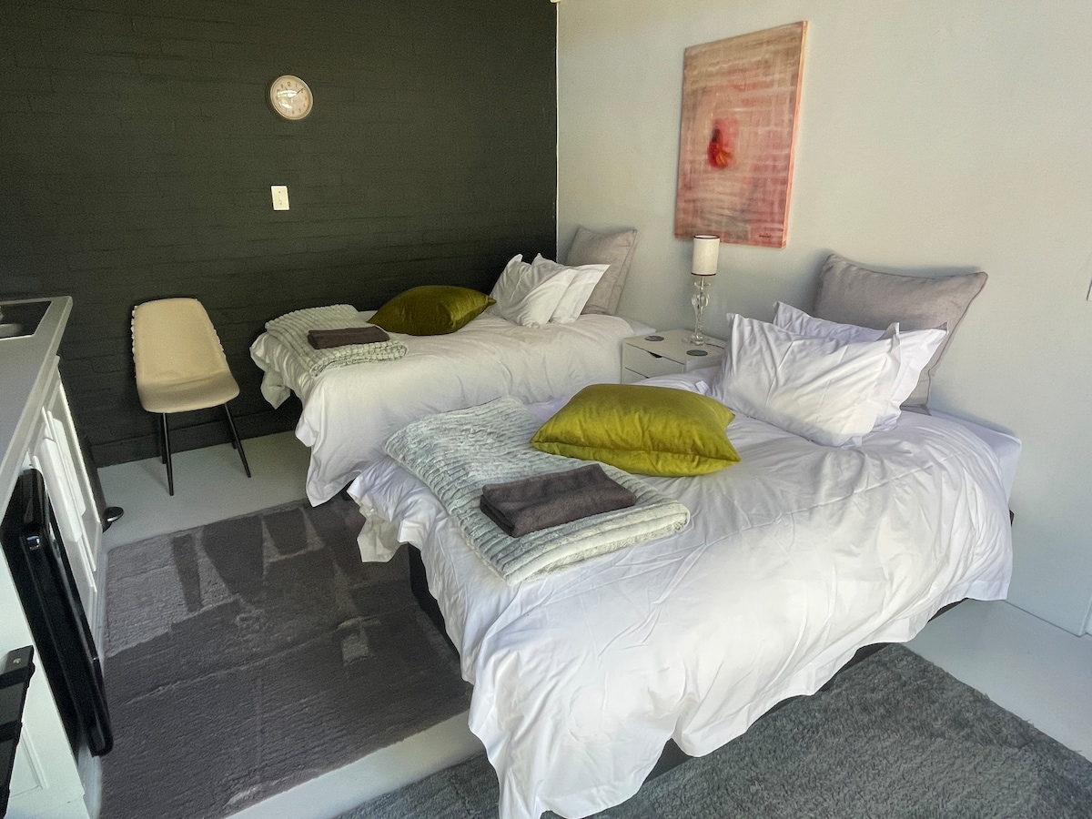 Relax in this stylish, modern, solar-powered loft in Mostertsdrift, Stellenbosch's prime neighbourhood. The open-plan kitchen, cozy living area, and private balcony with stunning mountain views to enjoy your morning coffee or a glass of wine, is perfect for up to three guests. Just a short walk from Lanzerac Wine Estate and close to cafes, shops, and dining spots. Enjoy scenic hikes or mountain biking in Jonkershoek Nature Reserve, wine tasting, or simply unwind—everything is at your doorstep!