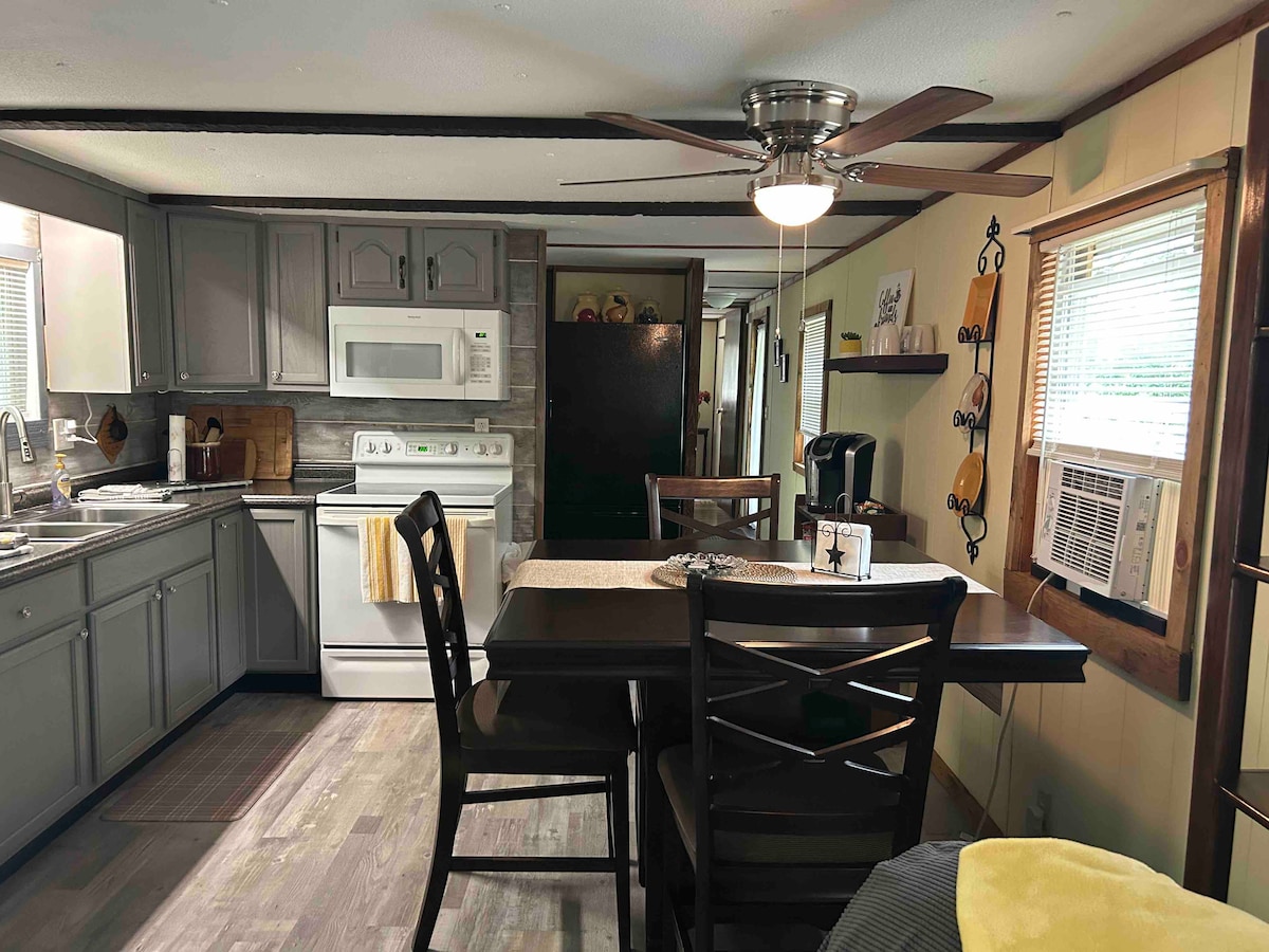 Come enjoy a relaxing & peaceful stay in a fully furnished renovated mobile home. This cozy retreat has everything you need for a enjoyable visit. •Fully stocked kitchen •Full bathroom•Washer and dryer•Desk/workspace•Two bedrooms, each with a queen mattress•Additional fold-up twin mattress available for floor use •Outdoor fire pit with wood provided. Coffee, tea, hot chocolate, snacks, toiletries, laundry detergent, paper towels are provided. •No smoking (outside only) •No parties •No pets
