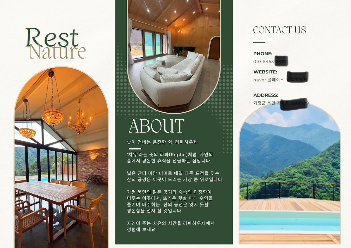 안다미로 는 "그릇에 넘치도록 많이" 라는 순 우리나라 말입니다. 뉴욕 출신 젊은 건축가의 건축설계 디자인으로 젊은 감성에 전원생활의 여유까지 독채의 프라이빗 함으로 느껴볼수 있는곳 도시생활 의 지친 일상에서 벗어나 힐링과 재충전이 되는 그런 공간입니다. 퇴근하고 매일 TV앞에 앉아 TV보다 잠이드는 일상을 반복하다보니문득 가족간의 대화가 너무 없어진것 같은 느낌이 들었어요.. 그래서 우리가족 힐링을 위한 세컨하우스에서는 가족들과 대화하는 시간을 만들어 보고자 TV를 과감하게 놓지 않았습니다. 대형 120인치 빔프로젝터 로 영화감상후 청정자연을 가까이서 느끼며 평소 가족들과 부족했던 대화와 소통이 많이지는공간 사랑이 넘치도록 가득한 안다미로 가평 에서 매일을 지겨운 일상을 벗어나 재충전과 휴식을 가져보세요~ 총 3개동의 건물이 붙어 있어요~ 호스트를 클릭하시면 안다미로가평 의 올리브/브라운/화이트 에 실시간 예약상황을 확인하실수 있습니다.