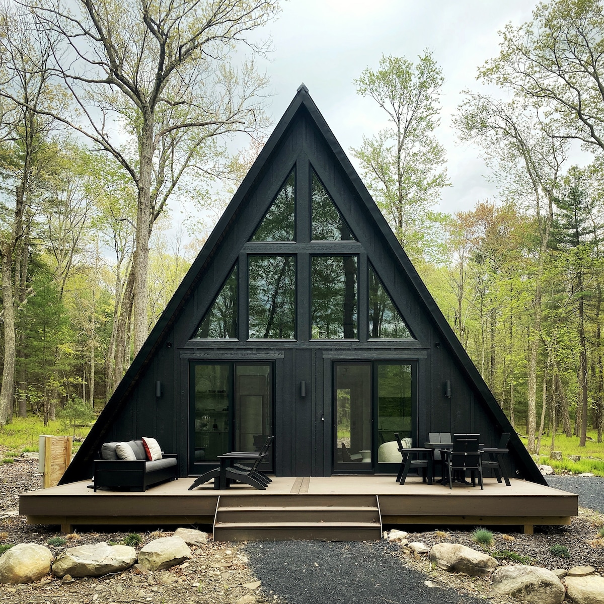 Escape to the Poconos at the Red Tail Retreat. Our cozy & stylish cabin has 5 PRIVATE BEDROOMS with 1 King, 3 Queen & 2 Twin Bunk Beds. Due to the community rules, we're only permitted to list it as 3 bedrooms on Airbnb. Relax in comfort by the fireplaces or play games in the entertainment room. You can hang out on the over-sized deck & have a soak in the 6-person hot tub on in relax in the backyard Sauna.