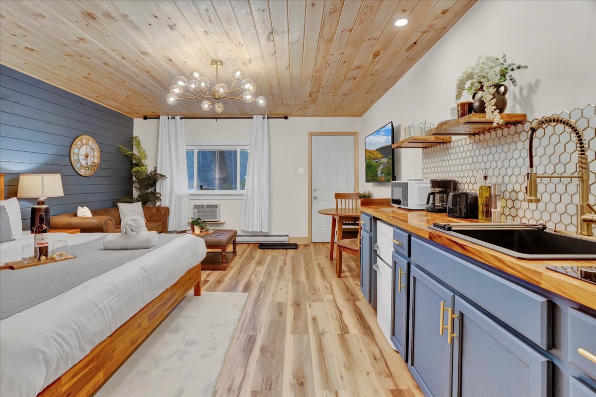 Two exclusive Swiftwater Queen mattresses with Frette luxury bed linen, 65" Smart TV, double vanities, high-pressure shower, plush robes and slippers, built in USB and USB C outlets, complimentary high speed wired and wireless Wi-Fi, touch pad room controls, desk, mini bar/fridge, in room safe, steamer, hair dryer, shower amenities, coffee station. Daily housekeeping and Swiftwater’s Signature Service. Approximately 350-375 square feet.