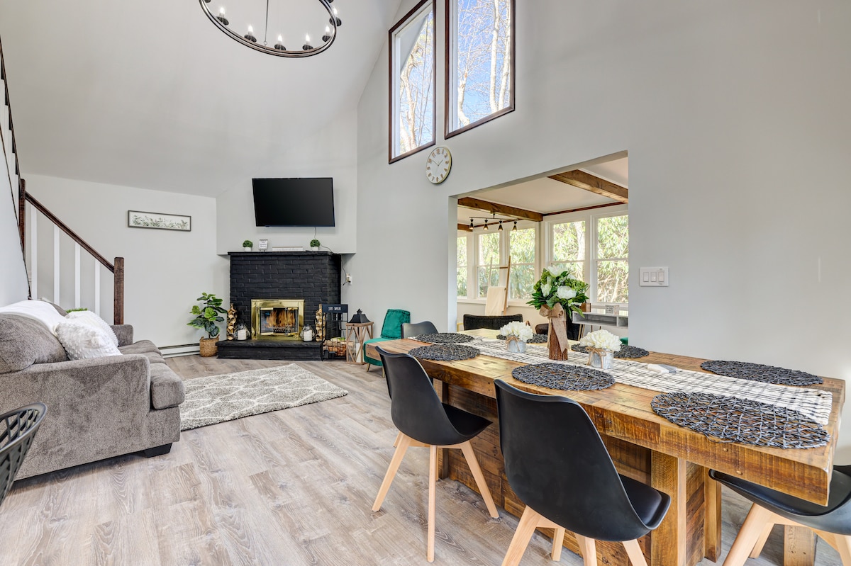 Escape to this beautifully renovated 5-bedroom chalet, a peaceful retreat at the end of a quiet street, surrounded by serene woods and a gentle stream. Ideal for families and groups, it blends nature and comfort. Enjoy an open living space with modern updates, large windows, and a fully equipped kitchen. Relax on the deck, gather around the fire pit, or explore nearby trails. Whether for adventure or relaxation, this secluded escape is the perfect getaway.