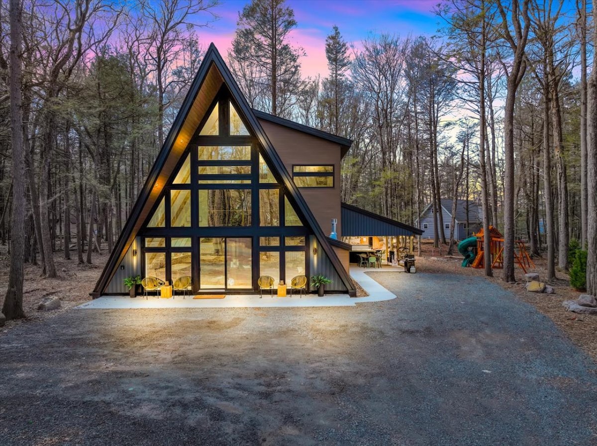 NEW Hot tub added! This little A-frame is a mid century dream nestled among the trees in the Pocono Mountains of Northeastern Pennsylvania and is within a few minutes walk to the lake. Beautifully and loving curated, filled with mid- century furniture, lots of art, books and records. A highlight of the cabin is the upstairs bathroom, featured in Condé Nast, Houzz and West Elm, it's a Pinterest dream come true. Come take a soak in our beautiful soaker tub among the trees. 2 hours from NYC.